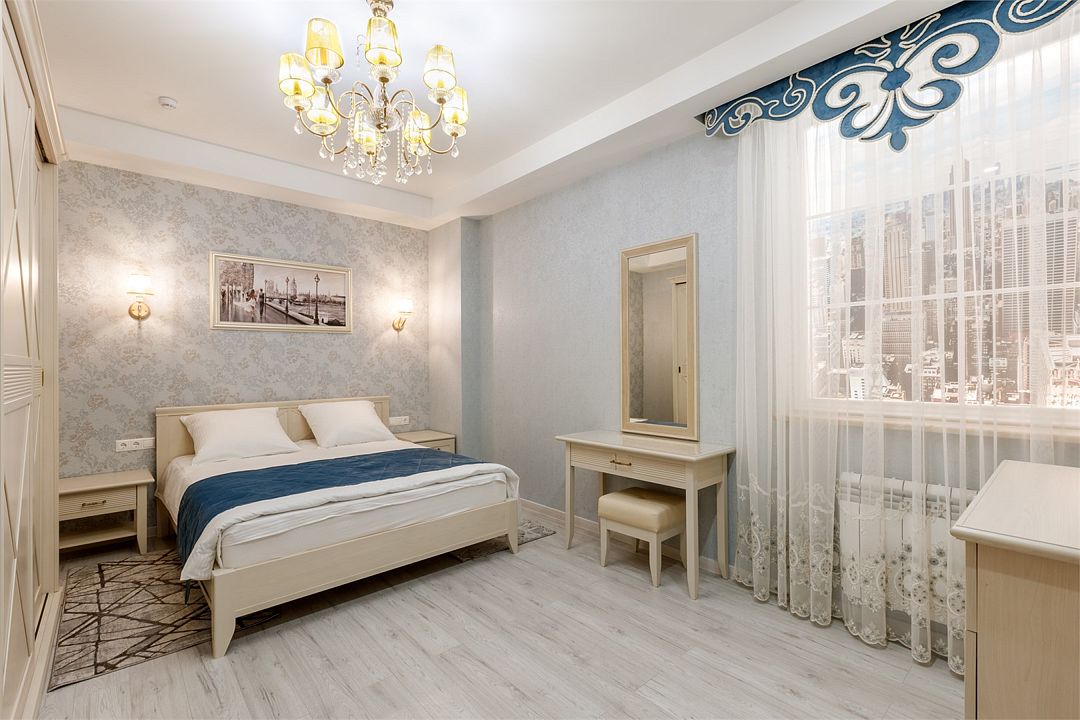 Wi-Fi, кондиционер, светильник, фен, электронные замки, душевая кабина, банные полотенца, тапочки, косметические средства, кровать «King size», шкаф для одежды, гардеробная, зеркало, мини-бар, чайный набор, набор посуды, унитаз, раковина, вид на город, стаканы, стул, стол, тумба, туалет, внутренний телефон, мини-холодильник, гостиничная парфюмерия, номер для некурящих, чайная станция, без питомцевВ гостиничном номере