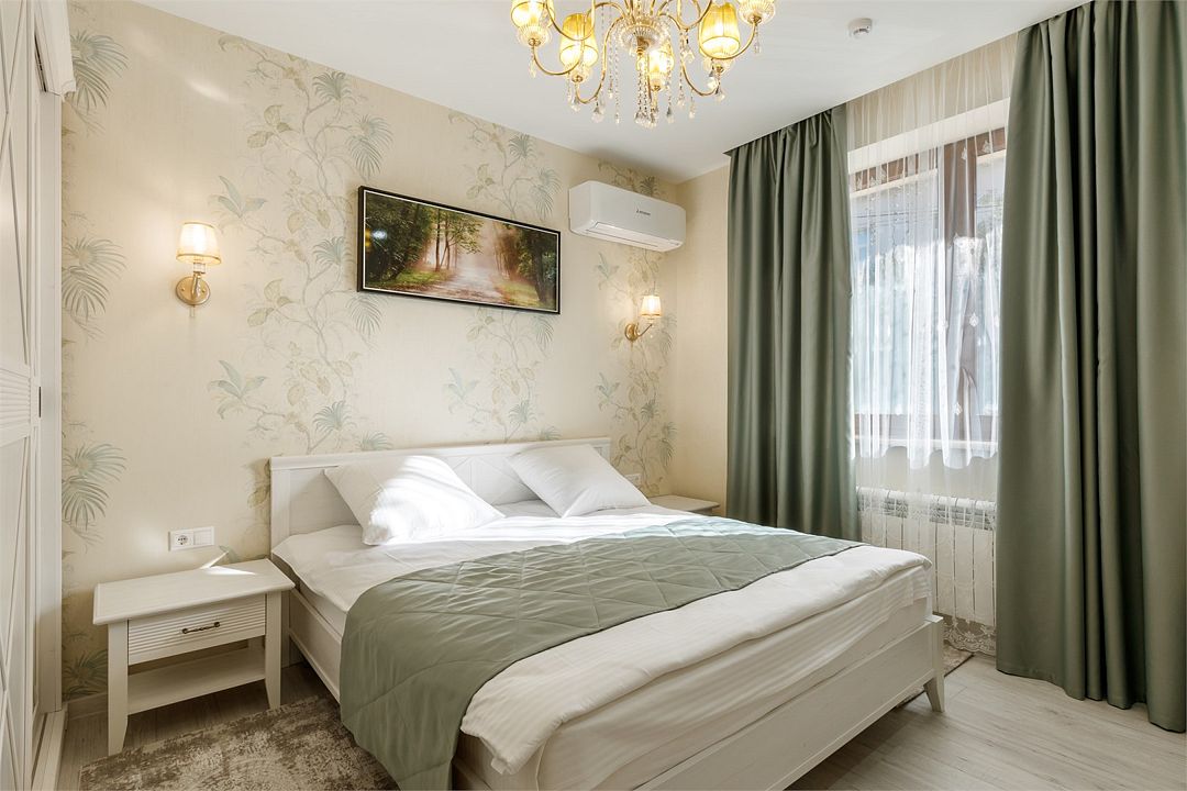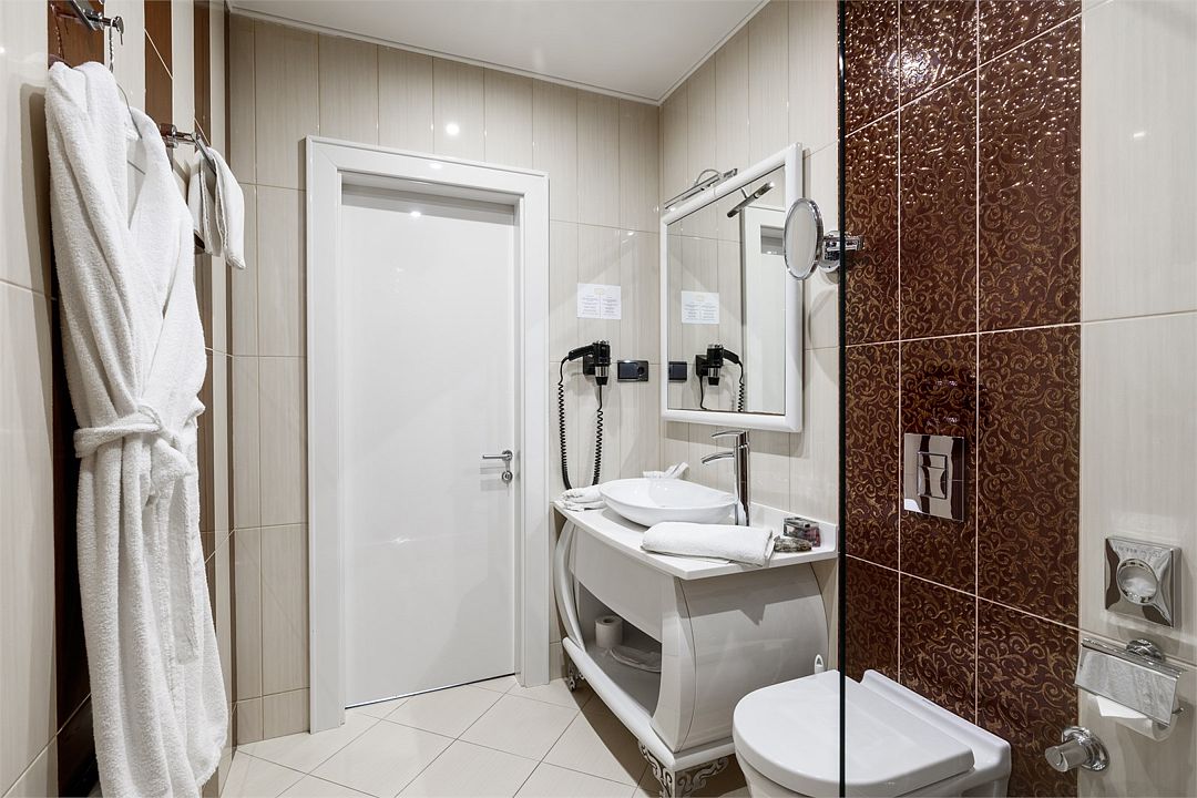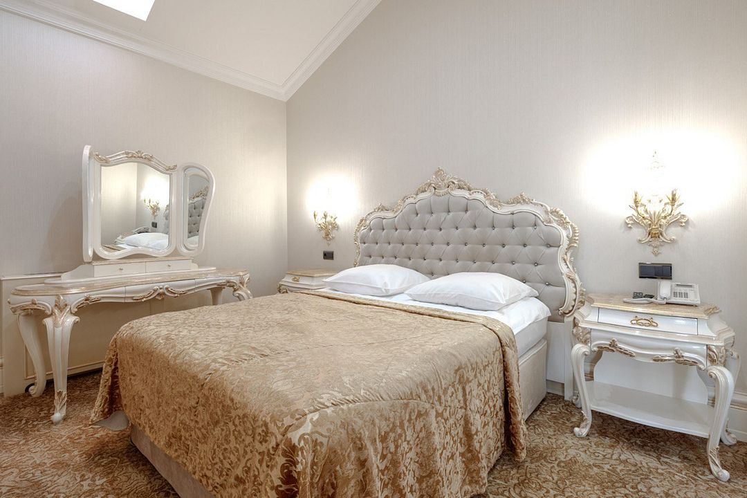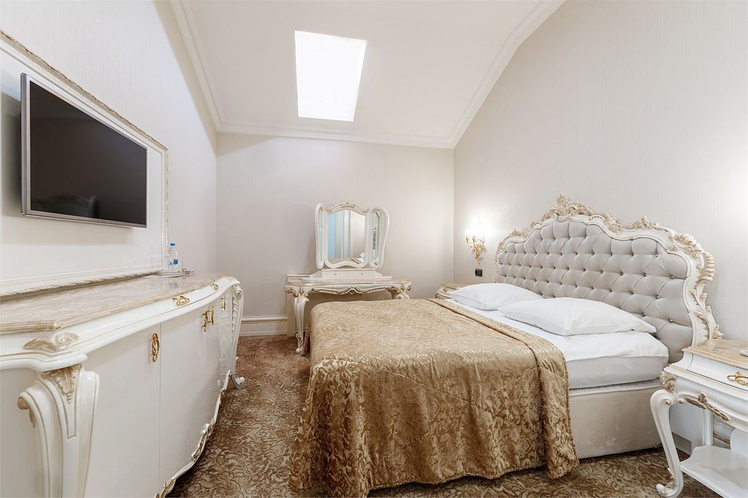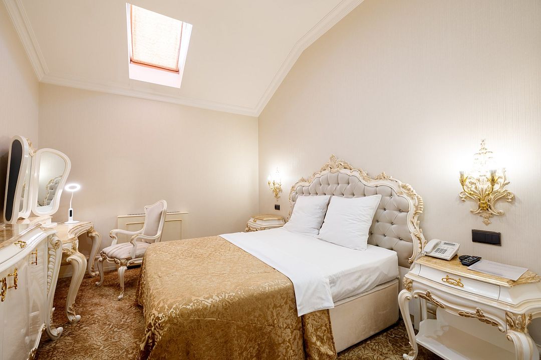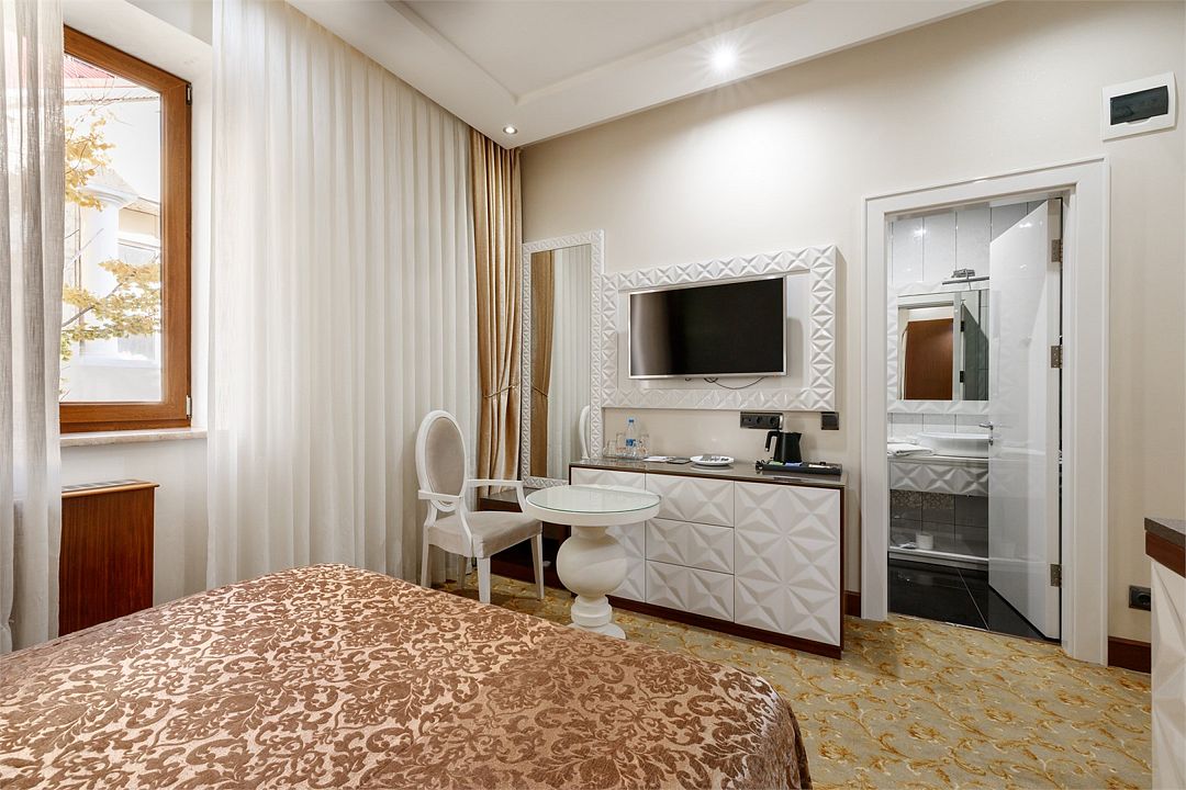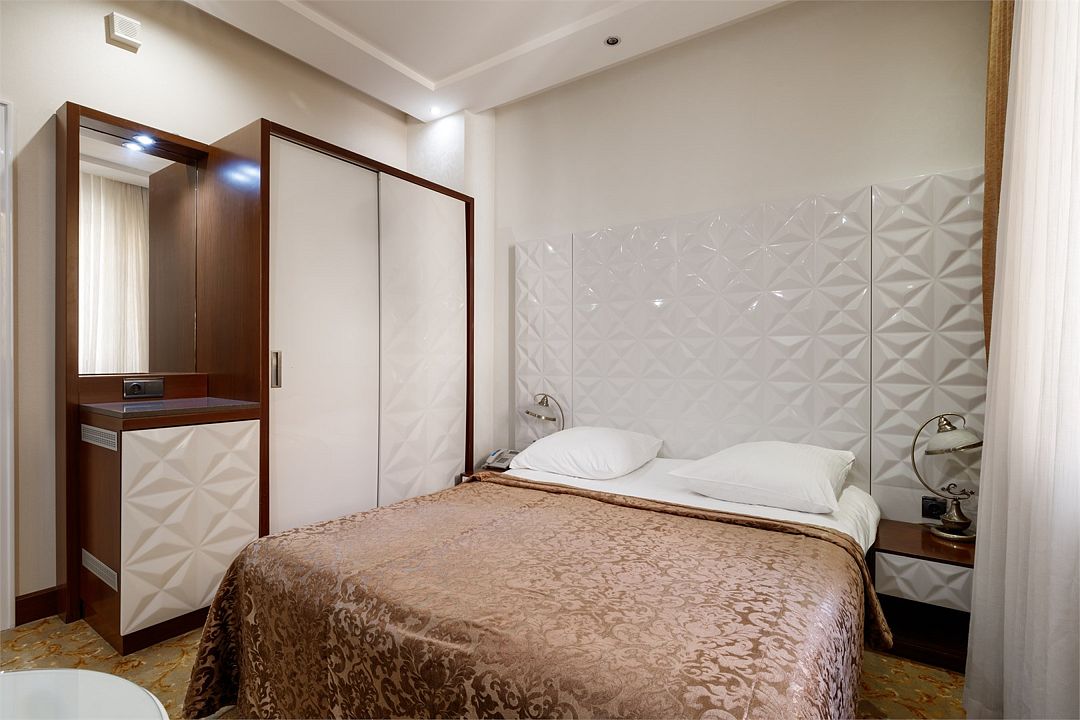 Однокомнатный просторный номер площадью 20 кв.м., окна на тихий двор: двуспальная кровать, шкаф/гардероб, кресло/стул, стол, сейф, набор посуды, мини - холодильник, кондиционер, телефонная связь, телевизор с плоским экраном, бесплатный Wi-Fi. Собственная ванная комната: душ, фен, полотенца, косметические принадлежности, тапочки, халат.Услуги и удобства