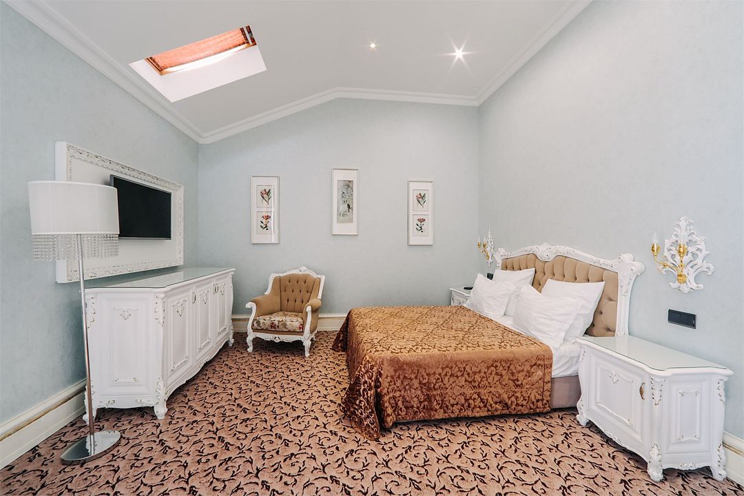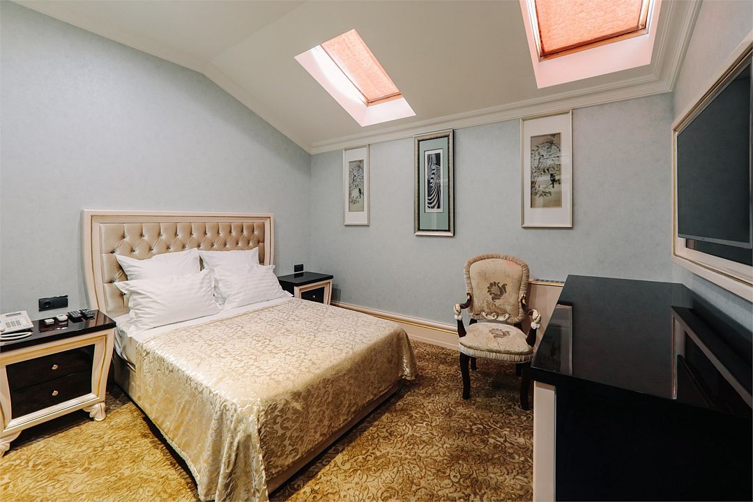 Однокомнатный просторный номер площадью 19 кв.м., мансардные окна (в небо) : двуспальная кровать, шкаф/гардероб, кресло/стул, стол, сейф, набор посуды, мини - холодильник, кондиционер, телефонная связь, телевизор с плоским экраном, бесплатный Wi-Fi. Собственная ванная комната: душ, фен, полотенца, косметические принадлежности, тапочки, халат.Услуги и удобства
