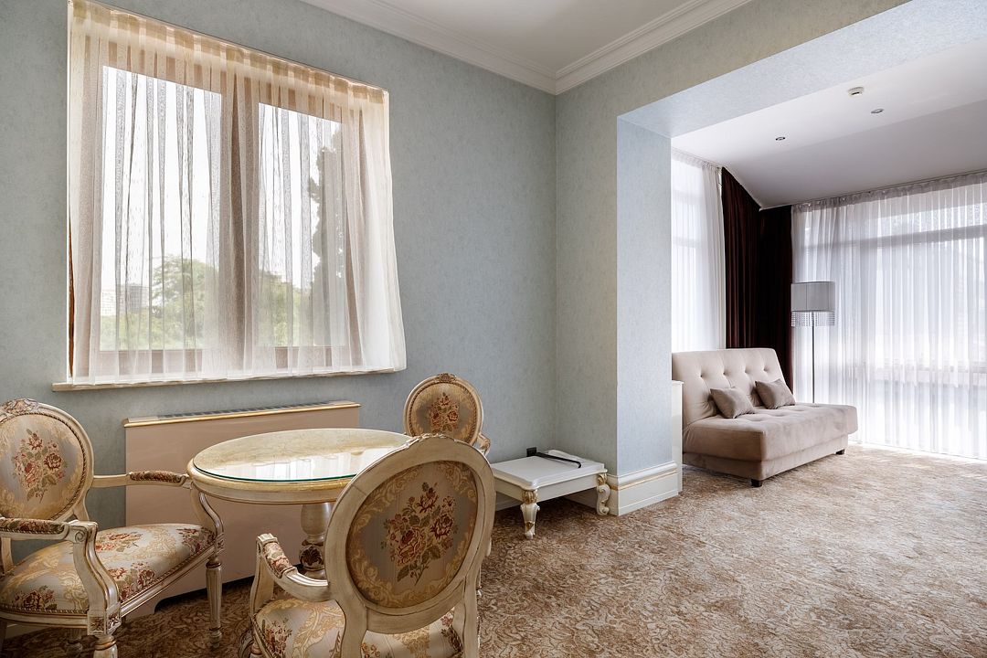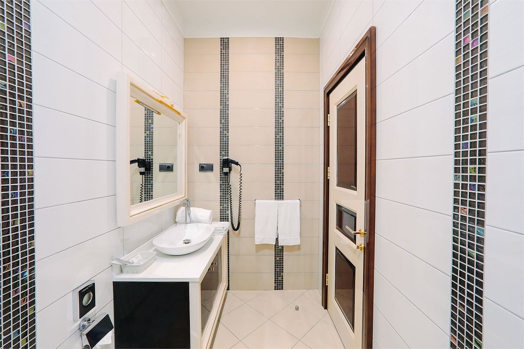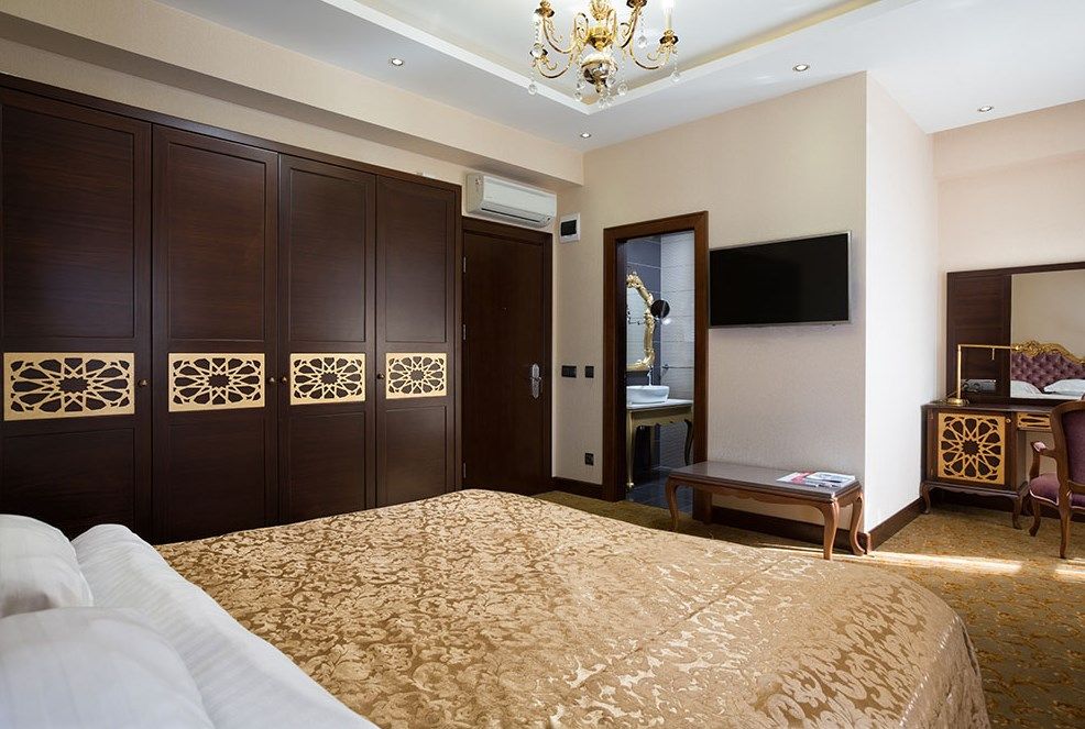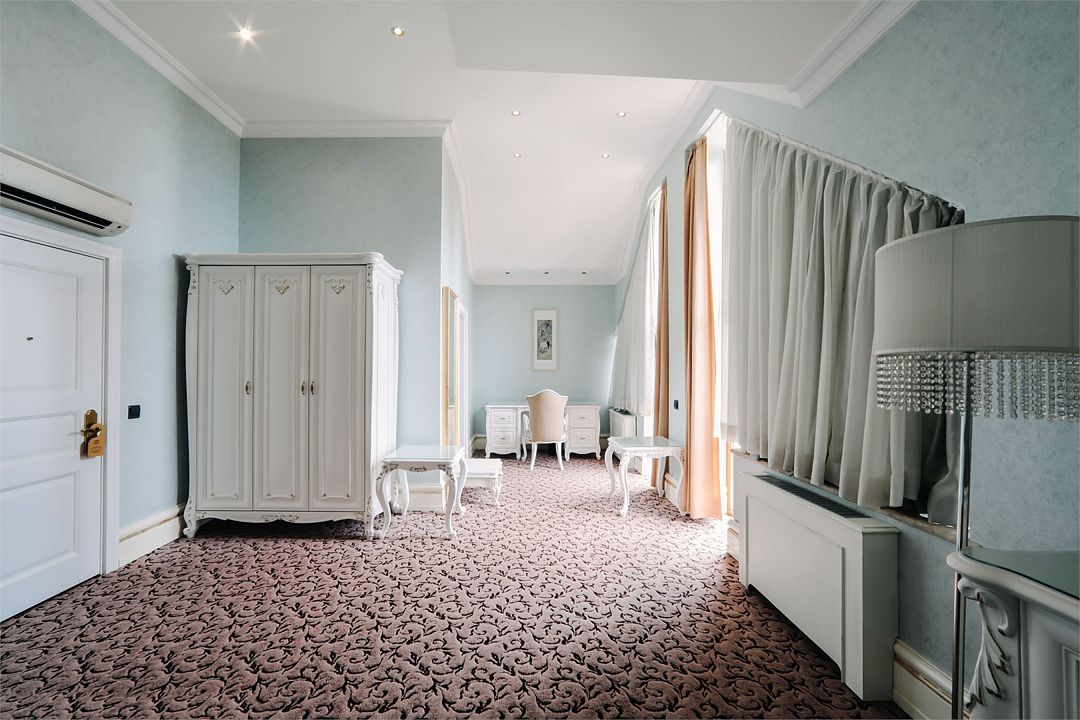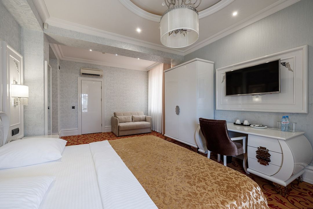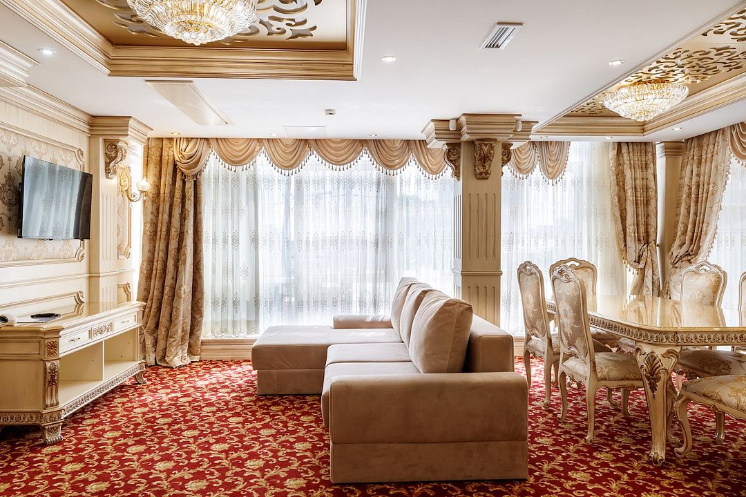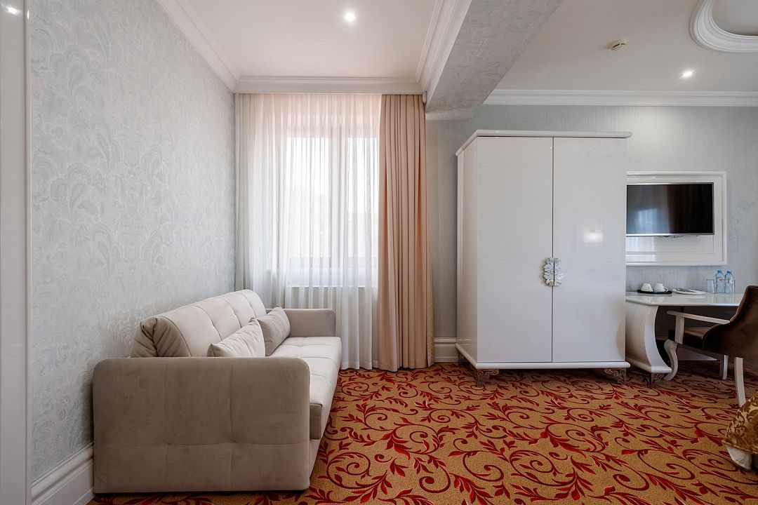Просторней других номеров площадью 78 кв.м.: двуспальная кровать, раскладной двухспальный диван, шкаф/гардероб, кресло/стул, стол, сейф, набор посуды, мини - холодильник, кондиционер, телефонная связь, телевизор с плоским экраном, бесплатный Wi-Fi. Собственная ванная комната: душ, ванна, фен, полотенца, косметические принадлежности, тапочки, халат.Услуги и удобства