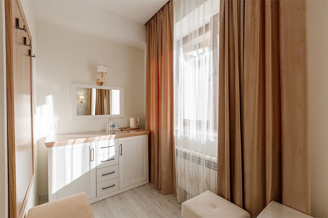 Однокомнатный просторный номер площадью 22 кв.м., без окна, 1 этаж: двуспальная кровать, шкаф/гардероб, кресло/стул, стол, набор посуды, чайная станция, мини - холодильник, кондиционер, телефонная связь, телевизор с плоским экраном, бесплатный Wi-Fi. Собственная ванная комната: душ, фен, полотенца, косметические принадлежности, тапочки, халат.Услуги и удобства