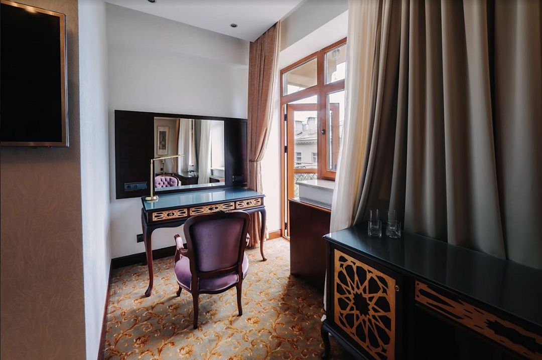 Wi-Fi, кондиционер, фен, электронные замки, душевая кабина, санузел, халаты, банные полотенца, тапочки, косметические средства, балкон, кровать «King size», односпальная кровать, тумбы, шкаф для одежды, журнальный столик, письменный стол, зеркало, комод, чайный набор, набор посуды, обслуживание номеров, сейф, чайник, раковина, ковровое покрытие, отопление, душ, вид на город, кресло, высокие потолки, стаканы, столовые приборы, туалетные средства, внутренний телефон, телевизор с плоским экраном, мини-холодильник, без питомцевВ гостиничном номере