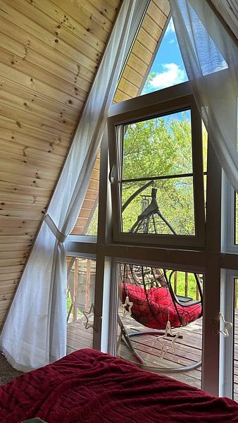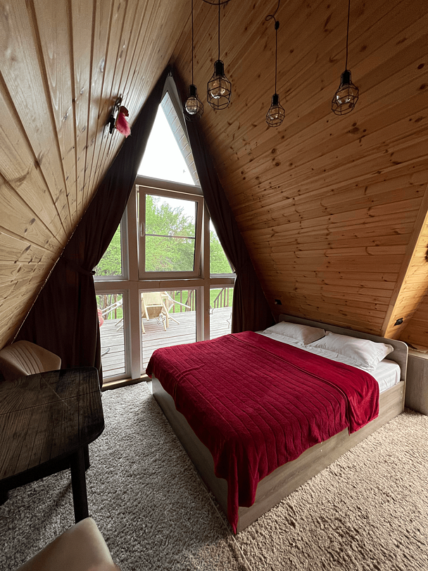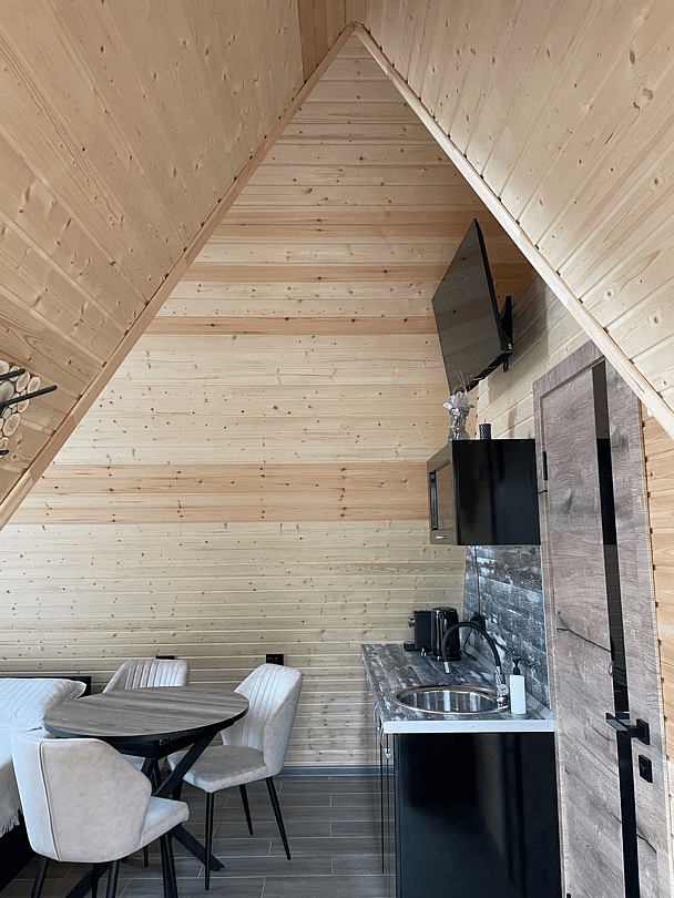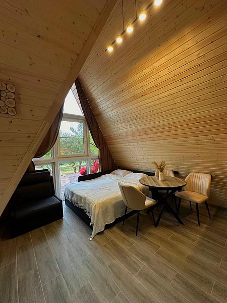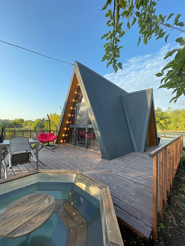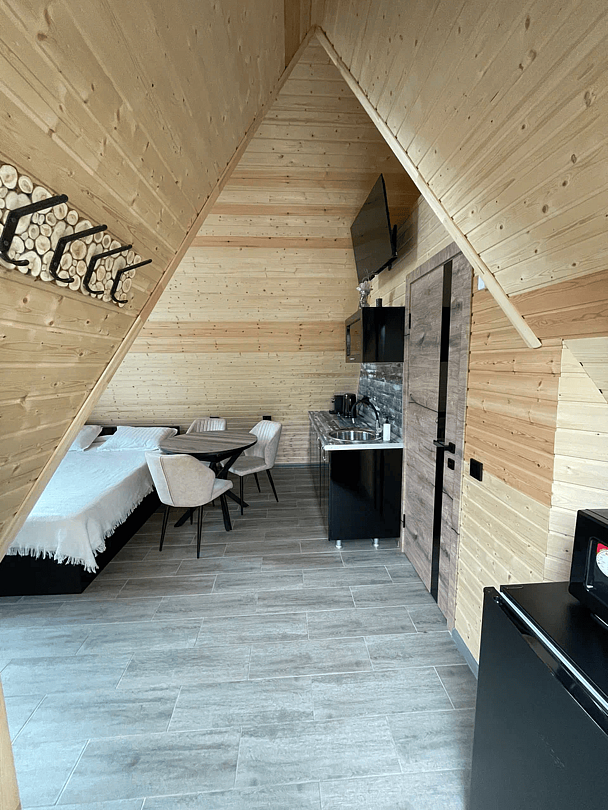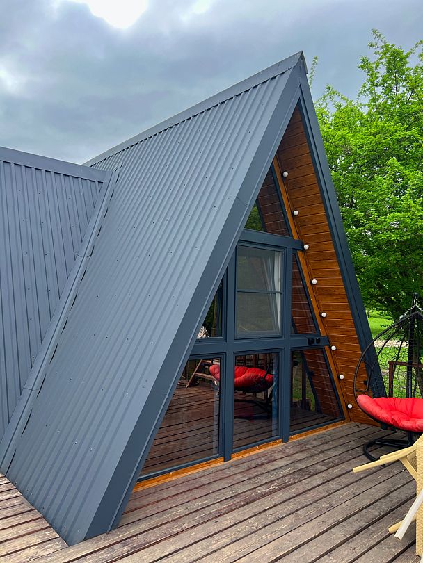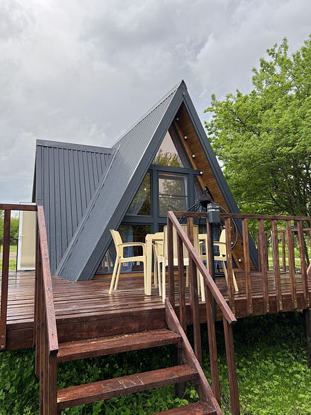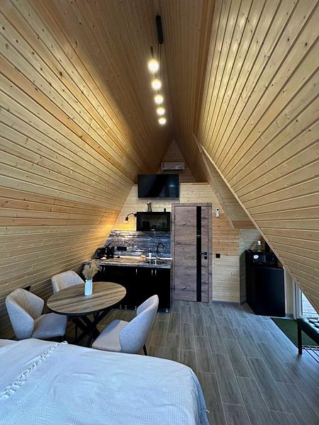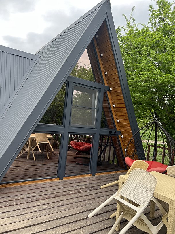 Треугольные домики A-Fraem представляют собой воплощение уюта и стиля. Их особенностью является отсутствие фасада — дом состоит только из крыши и панорамных окон, что обеспечивает особый уют. Все дома полностью обустроены и имеют всё необходимое для комфортного проживания. Рядом с каждым — своя терраса, выход к сибирскому чану, костровой и мангальной зонам.
