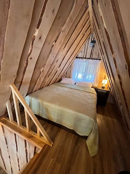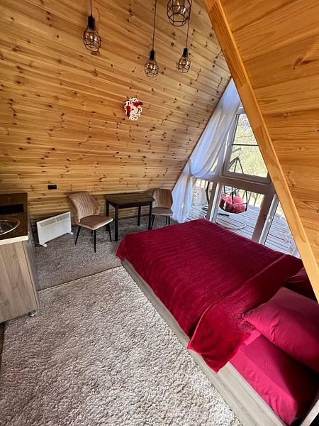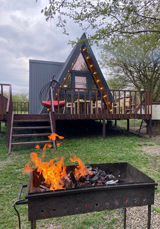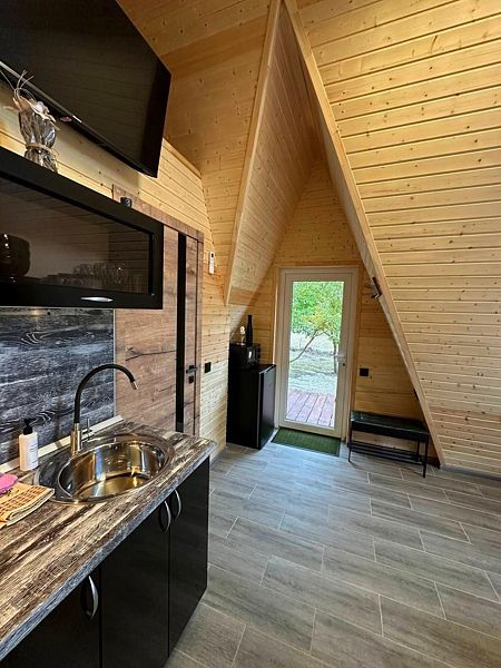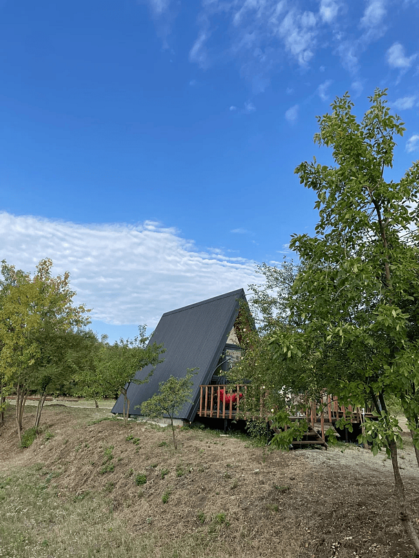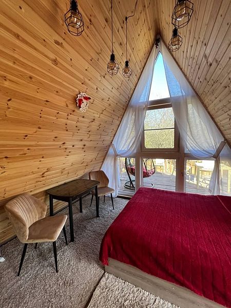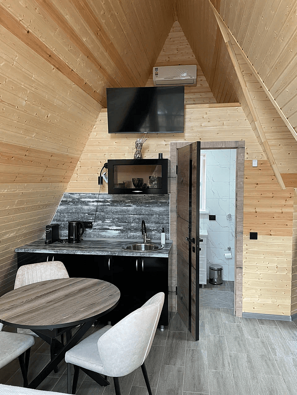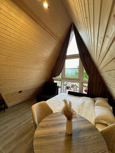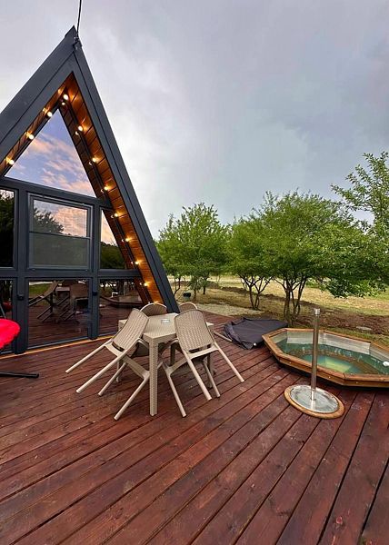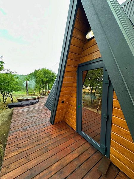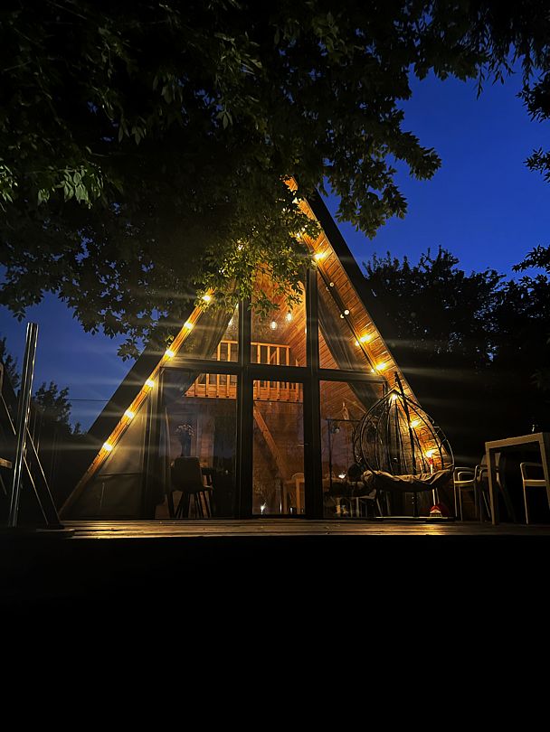 Треугольные домики A-Fraem представляют собой воплощение уюта и стиля. Их особенностью является отсутствие фасада — дом состоит только из крыши и панорамных окон, что обеспечивает особый уют. Все дома полностью обустроены и имеют всё необходимое для комфортного проживания. Рядом с каждым — своя терраса, выход к сибирскому чану, костровой и мангальной зонам.