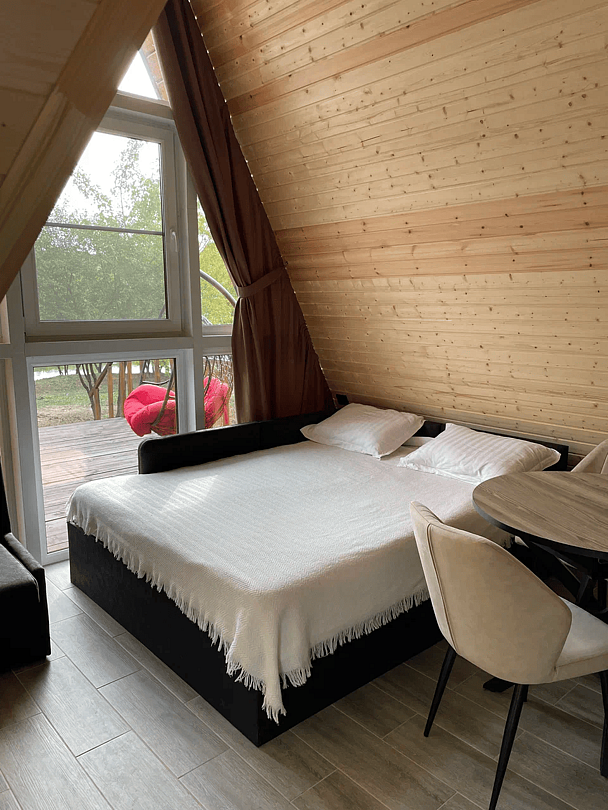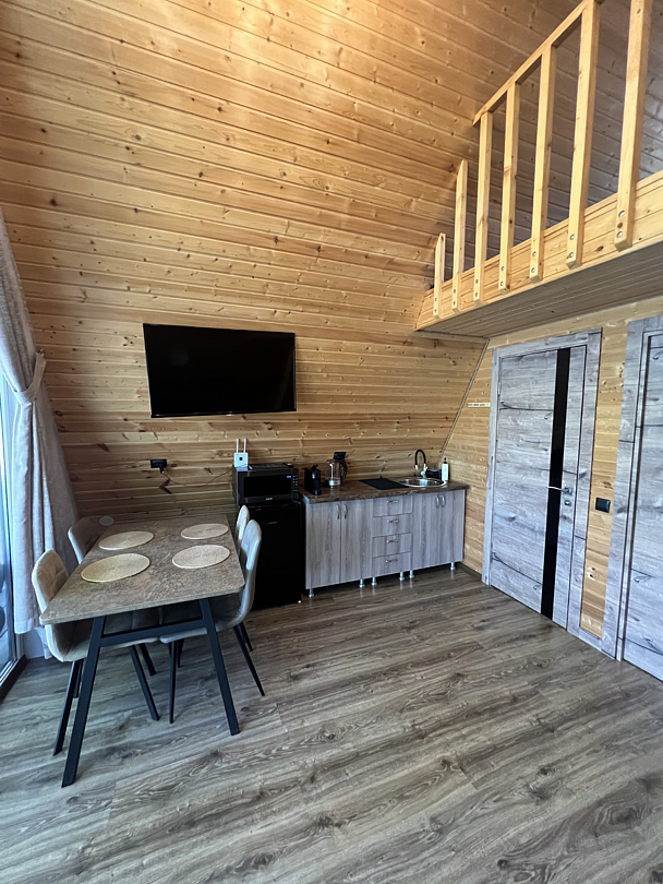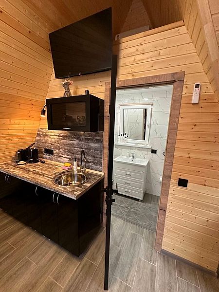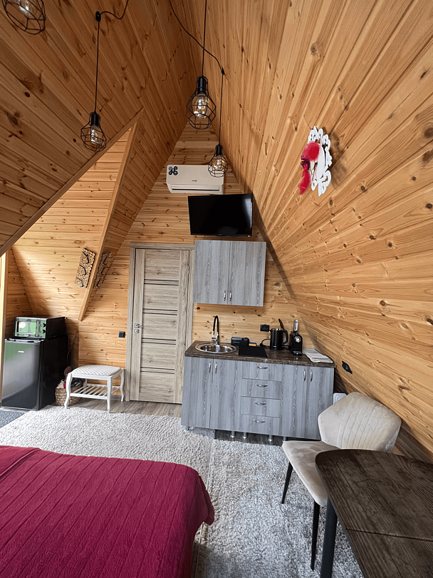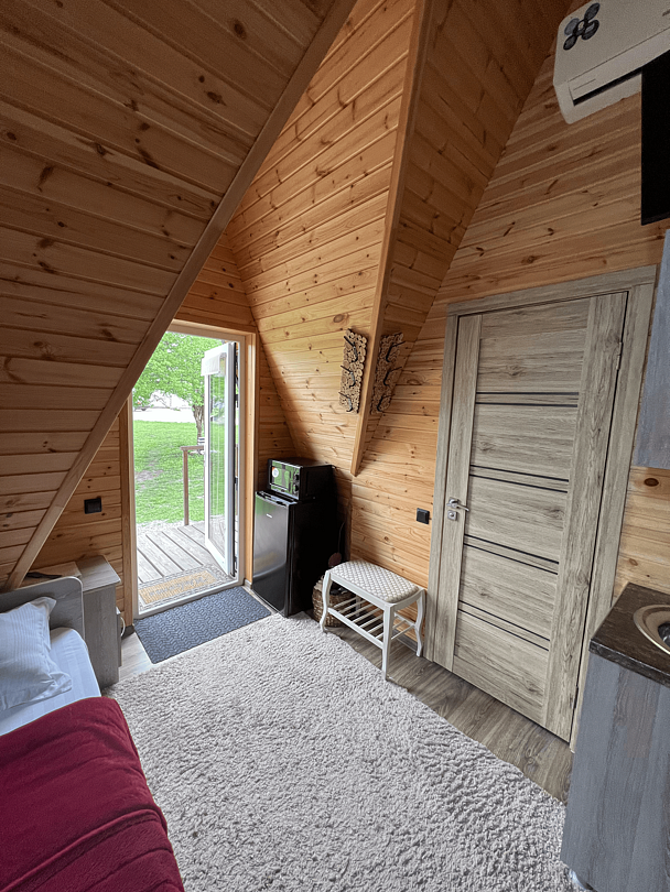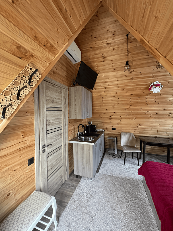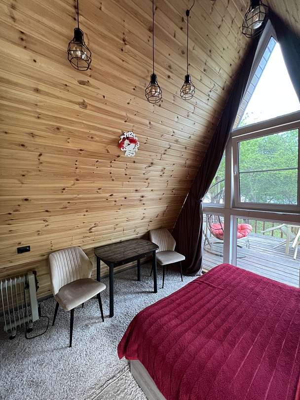 Треугольный домик до 3 человек. Панорамное остекление, кухня (со всей необходимой посудой), холодильник, микроволновая печь, чайник, комната совмещённая с кухней, сплит система, телевизор, кровать двухспальная, кресло раскладное, постельное белье.