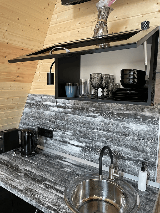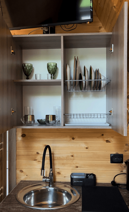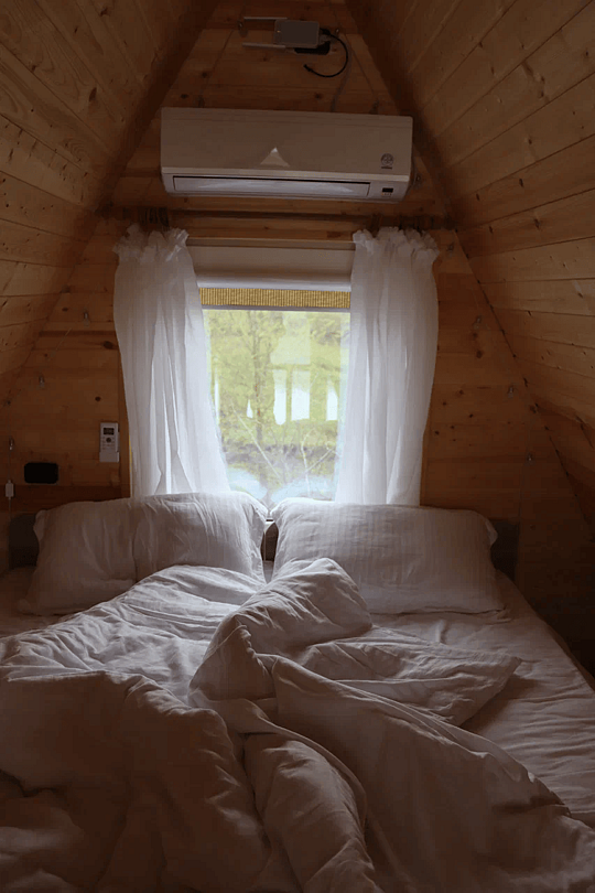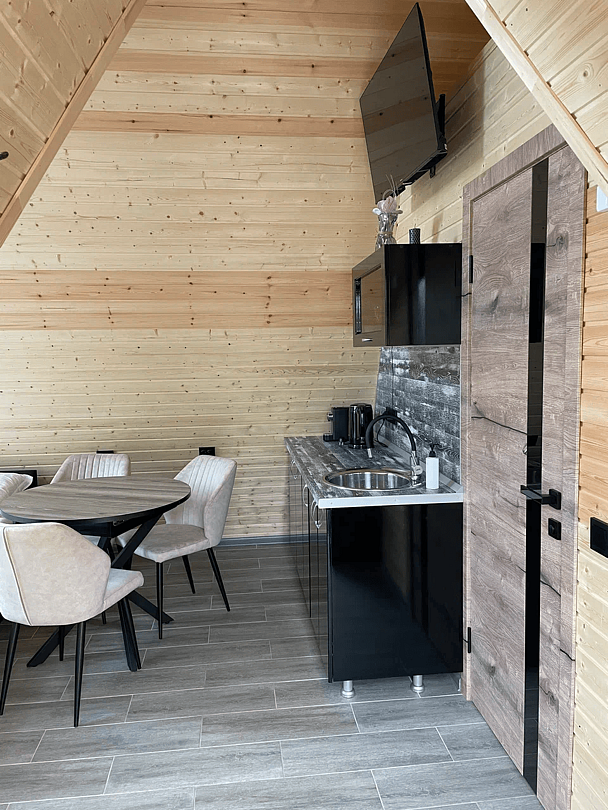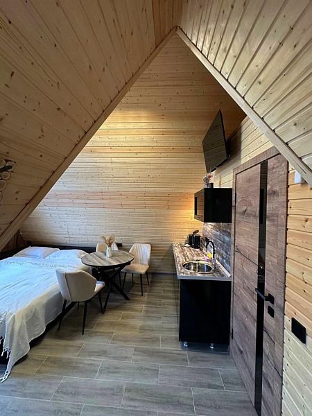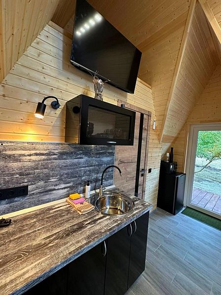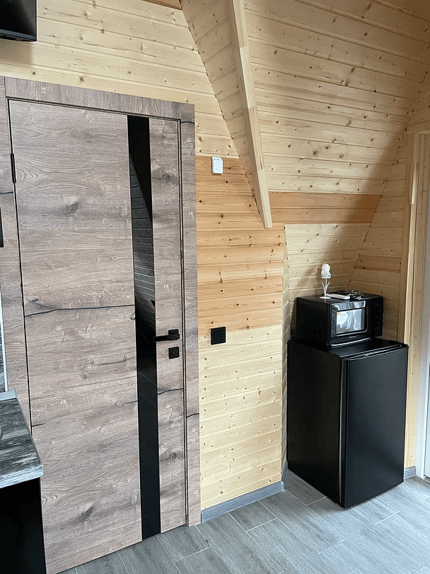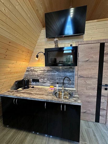 Треугольный домик до 3 человек. Панорамное остекление, кухня (со всей необходимой посудой), холодильник, микроволновая печь, чайник, комната совмещённая с кухней, сплит система, телевизор, кровать двухспальная, кресло раскладное, постельное белье.