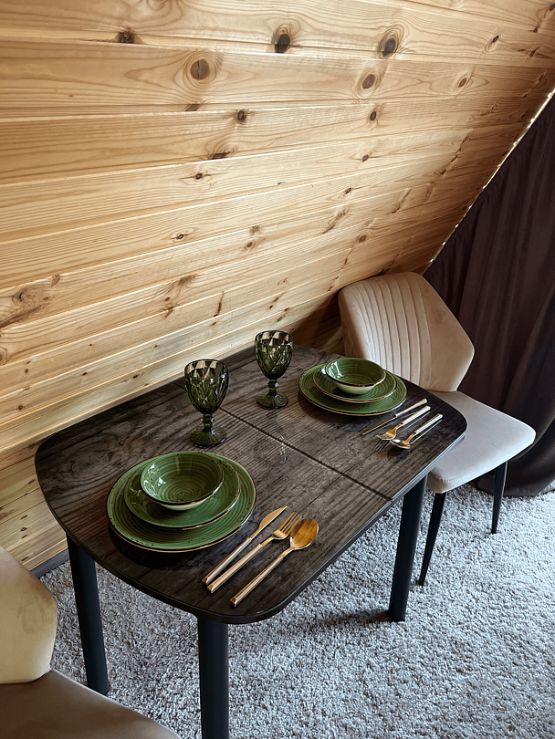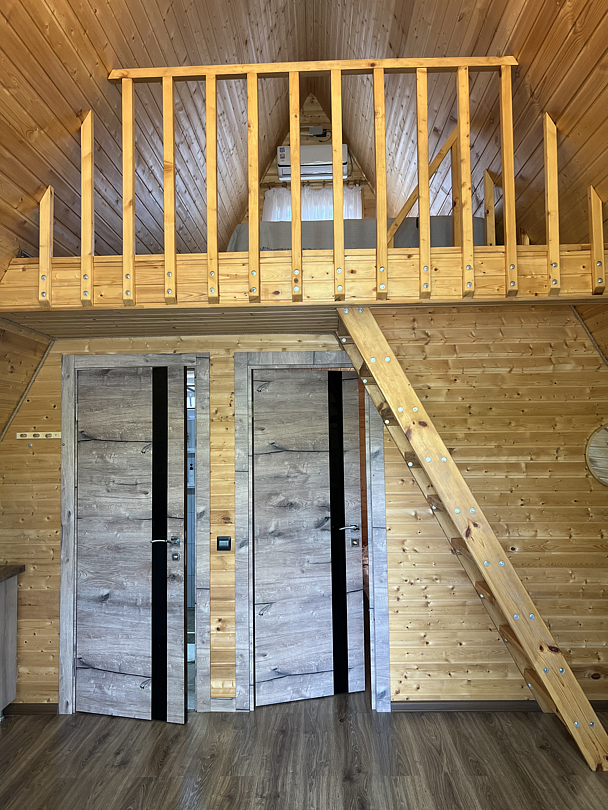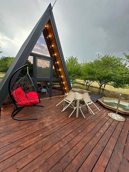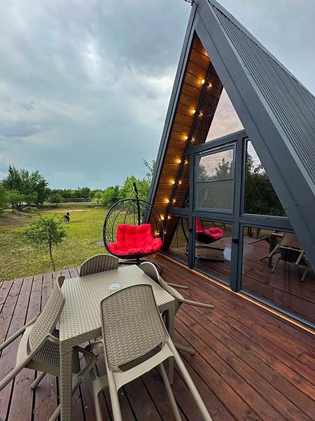 Стильный треугольный домик, рассчитан на 1-6 человек. В домике есть все для комфортного проживания — кухня со всей необходимой посудой, холодильник, микроволновка, чайник, панорамное остекление, сплит система, терраса с мангальной зоной, горячий чан (оплачивается отдельно).