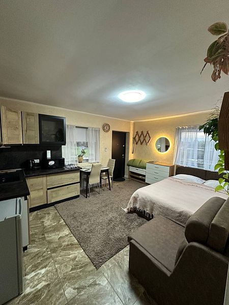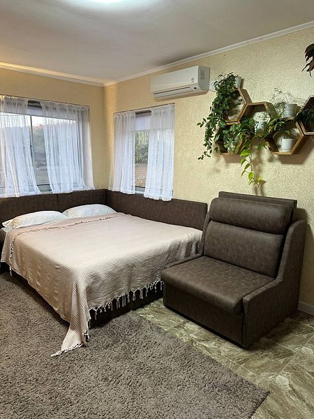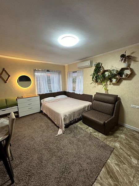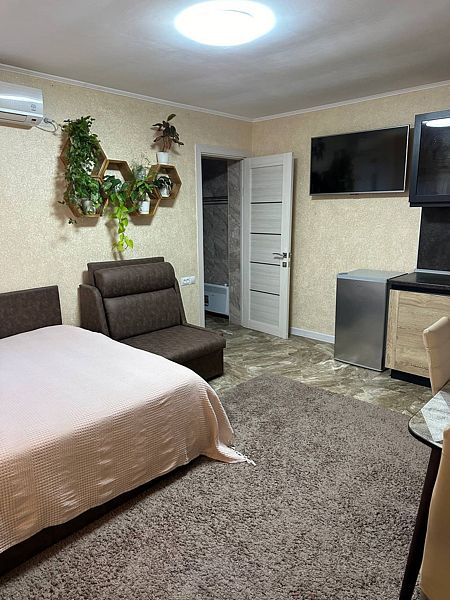 Телевизор, изолированная комната, кровать двухспальная, постельное белье, шкаф, тумба, диван, ванная комната, душ, фен, полотенца, стулья, стол, водонагреватель, подвесное кресло, стабильный wi-fi.