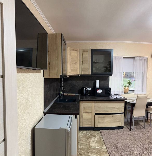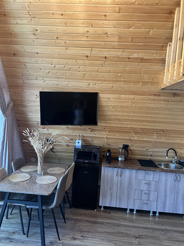 В домике большой диван, раскладное кресло, кухня, чайник и кофеварка, микроволновка, холодильник, электрическая плита и вся необходимая посуда, обеденный стол, стулья, ванная комната, гигиенические принадлежности, фен, полотенца, обогреватель, мангал, Wi-fi.
