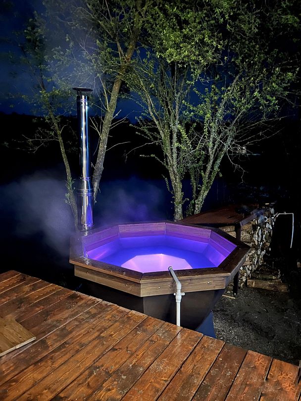 Баня на дровах с джакузи с подогревом находится в треугольном домике Спа. Домик отапливается, теплый пол.