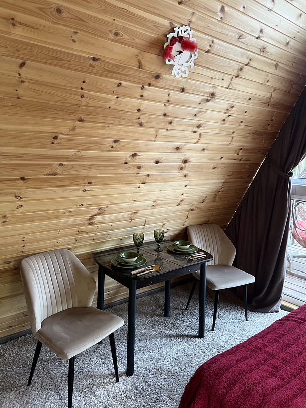 Панорамное остекление, сплит-система, беседка с мангальной зоной, телевизор, кровать двухспальная на втором этаже, диван раскладной на первом этаже, постельное белье, шкаф, тумба, ванная комната, душ, фен, полотенца, халаты, стулья 6 шт, стол, водонагреватель, подвесное кресло с мягкой подушкой, стабильный wi-fi.