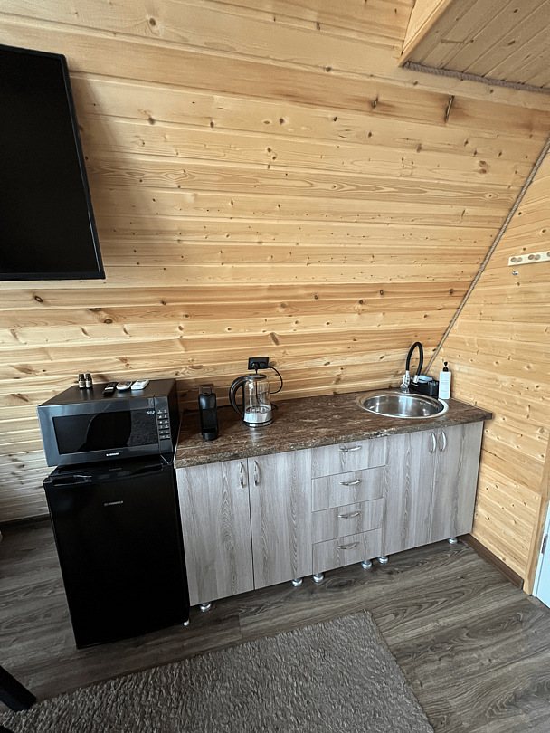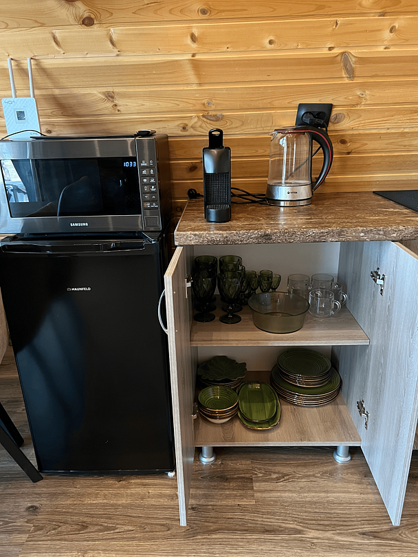 В домике есть все для комфортного проживания — баня со всеми необходимыми банными принадлежностями (тапочки, веники, халаты, шапочки, простыни), кухня со всей необходимой посудой, холодильник, микроволновка, чайник, кофемашина зерновая (для американо) капсулы предоставляются.