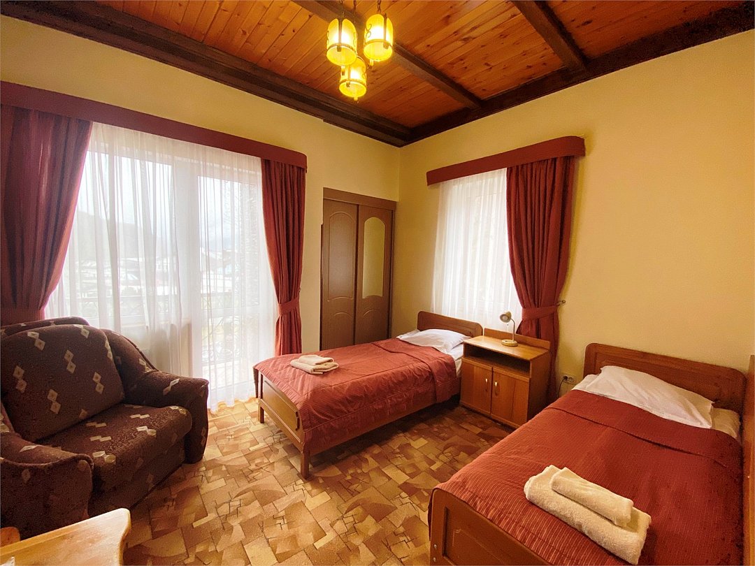 Мебель: одна 2-спальная кровать, две 1-спальные кровати, прикроватные тумбочки, шкаф, мягкая мебель, журнальный столик, стулья.