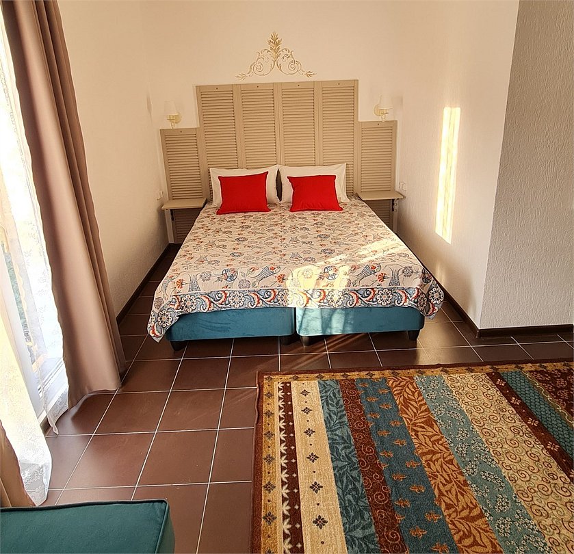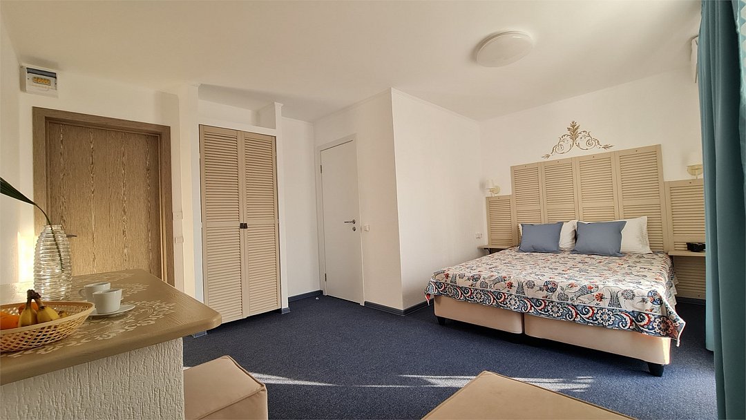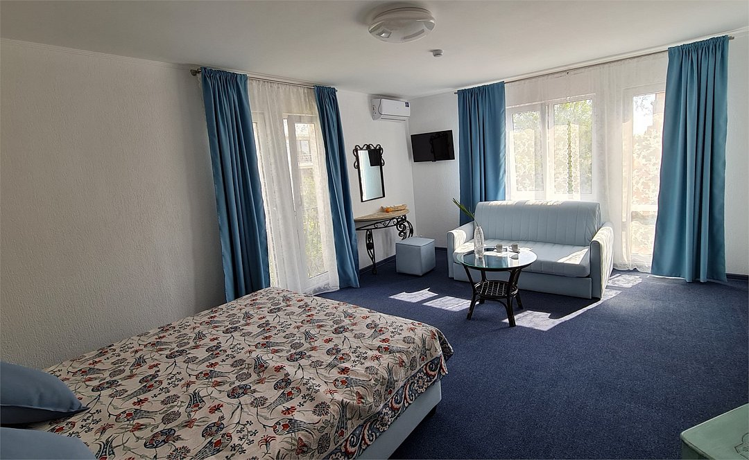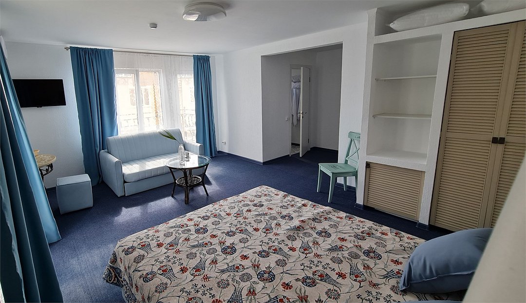 Просторный семейный номер с балконом включает в себя двуспальную кровать (king size) , двуспальный диван, телевизор , холодильник , сейф, кондиционер, просторный балкон.Услуги и удобства