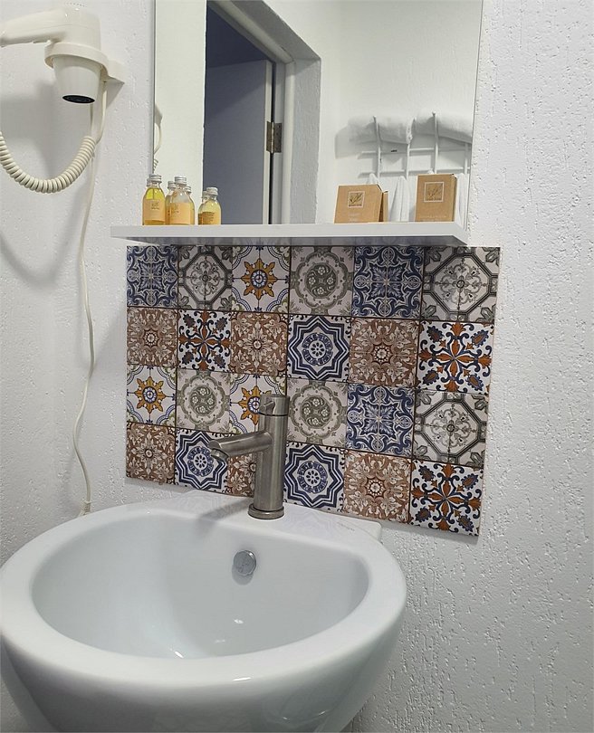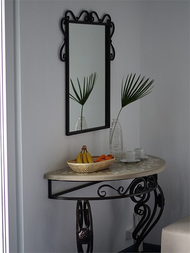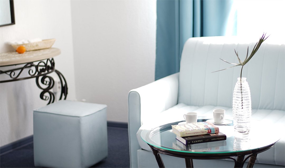 Окна у нас выходили во двор и мы избежали лишних шумом с улицы Луначарского, куда выходил парадный вход и фасад отеля. И цветовая гамма выдержанна в греческом, курортном, стиле. Вообщем условия на 10+