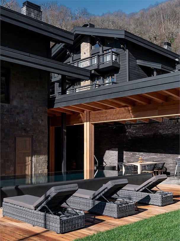 Расслабьтесь в просторном трехэтажном Шале с видом на горные вершины, с открытой террасой и подогреваемым бассейном. Шале включает в себя 2 уютные гостиные, 4 спальни с индивидуальными ванными комнатами и кабинет. Из гостиной и спален с террасой открывается великолепный вид на горы. В вашем распоряжении комфортная кухня, полностью оборудованная премиальной техникой и посудой BORK. В трехэтажном шале разместится 8 человек. На нижнем этаже расположена гостиная, гостевая спальня с собственным санузлом, финская сауна с ванной комнатой, тёплый гараж. На среднем этаже – просторная кухня-гостиная с выходом на террасу, кабинет и ванная комната. На верхнем этаже находятся 3 спальни с ванными комнатами. На террасе также располагается всесезонная кухня, с зоной отдыха, барбекю и камином. Сервис в шале: - администратор/ресепшн, -ежедневная уборка -трансфер (по запросу) Комплектация шале: - детские кровати и стульчики, -премиальная техника BORK, -посуда BORK, -стиральная и сушильная машины, -гладильная система BORK, -халаты, тапочки, туалетные принадлежности, -телевидение, WI-FI, -подогреваемый гараж, -финская сауна, -массажное кресло BORK, -площадка для баскетбола, -всесезонный бассейн. Расстояние от аэропорта Адлера до шале- 41 км. Расстояние до ближайшей горнолыжной трассы - "Красная Поляна" -12 минут на автомобиле ( 5,2 км).Услуги и удобства
