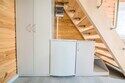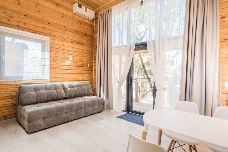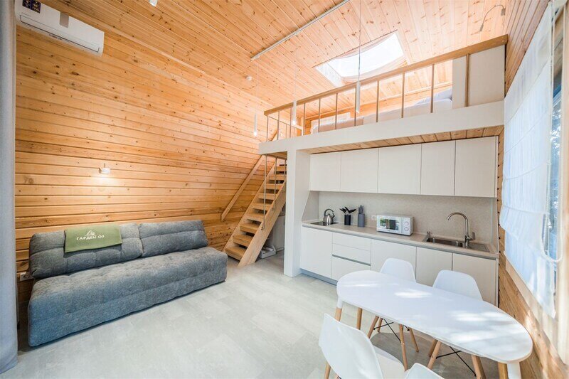 На первом уровне: раскладной диван, обеденный стол на 4 персоны, зона кухни и ванная комната. Теплый пол на всем уровне, оборудованная кухня.