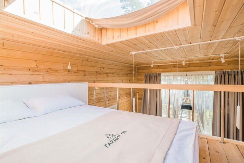 На втором уровне: большая двуспальная кровать, окно с видом на звездное небо.