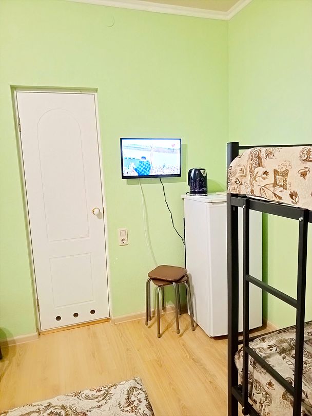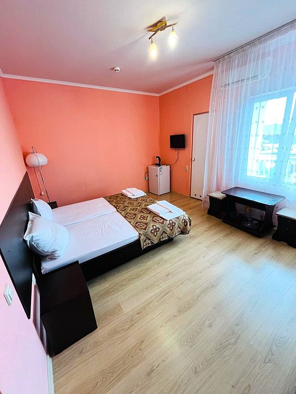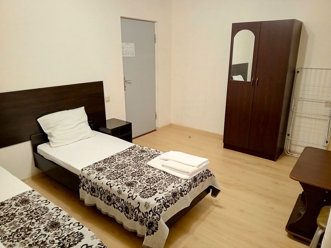 В номере: кровати односпальные широкие 2 шт. (или двухспальная кровать 1 шт), двухъярусная кровать длина 2,1 метра, телевизор, шкаф, холодильник, электрический чайник, посуда, собственная ванная комната (душ, туалет), набор полотенец для душа, ортопедические новые матрасы, балкон, кондиционер (СПЛИТ система), сушилка для одежды, утюг на этаже, фены на этаже, стол, стулья, столик для балкона, тумбочки, Wi-Fi.