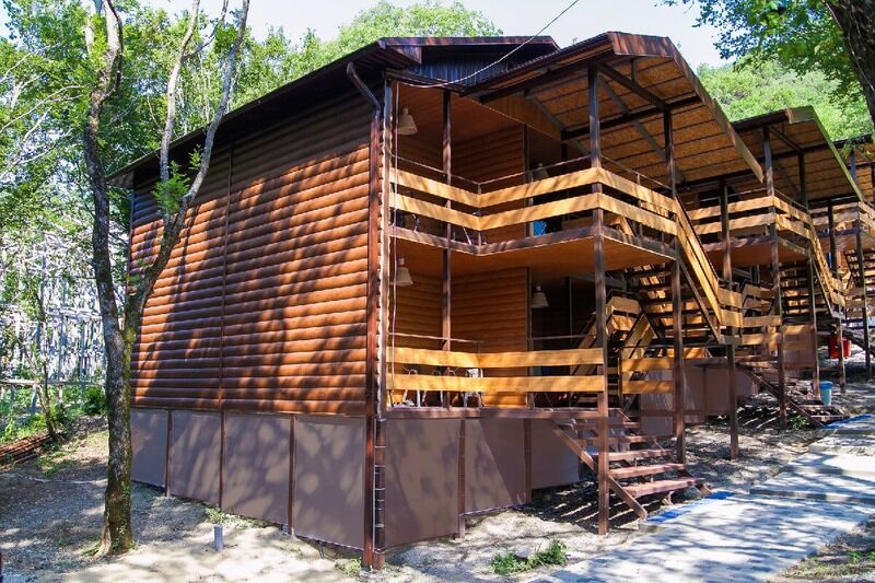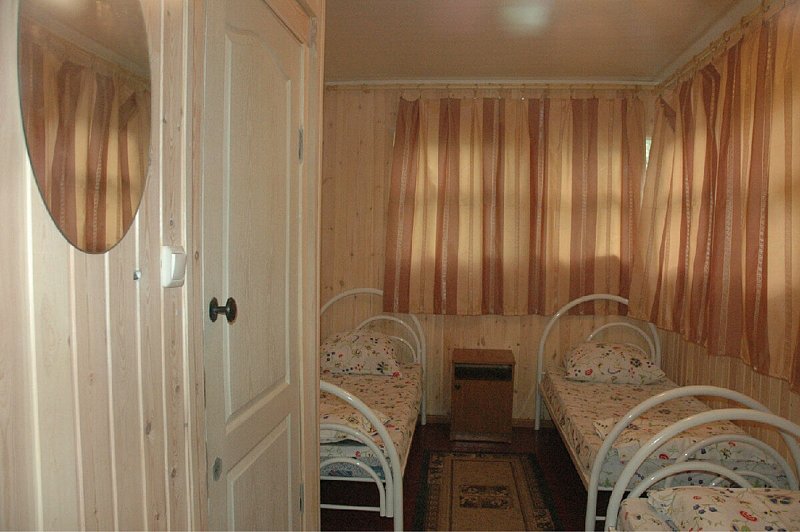 Проживание в деревянных коттеджах с открытыми террасами, в 2-х и 3-х местных номерах, оборудованных для комфортного проживания: кровати, тумбочки, коврики, шкаф для вещей