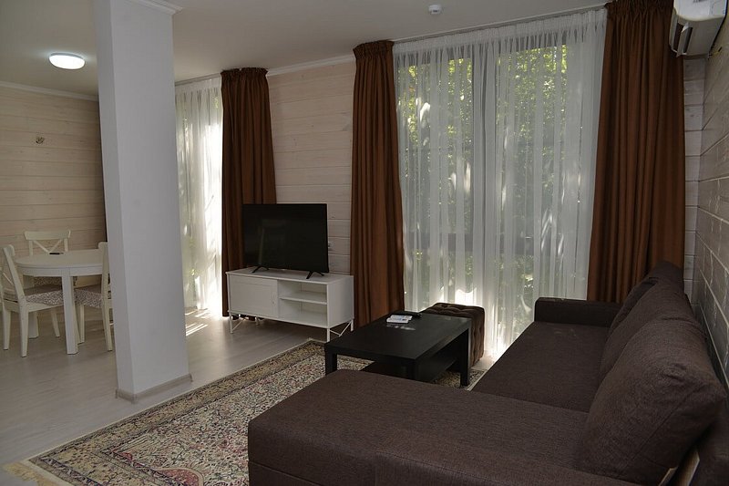Проживание в комфортабельном 2-х комнатном 4-х местном номере со всеми удобствами и кухней. В номере имеется: кухня, гостиная, две раздельные комнаты, шкаф-купе для одежды (с зеркалом), сплит-система, телевизор ЖК (спутниковое телевидение), ванная комната. Есть своя терраса, укомплектованная мебелью (стол, кресла).