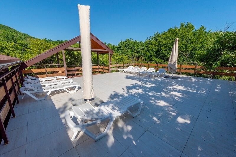 Семейный отдыхДостоинстваИз года в год мы большой компанией отдыхаем в этом гостиничном комплексе. Нам нравится зелёная территория, чистый большой бассейн с отдельной зоной для детей, удобная мангальная зона, а также приветливый и дружелюбный персонал. Важно, что на входе и выходе дежурит охранник, который контролирует доступ на территорию и не допускает самостоятельный выход детей за пределы. До моря всего 15 минут неспешным шагом.