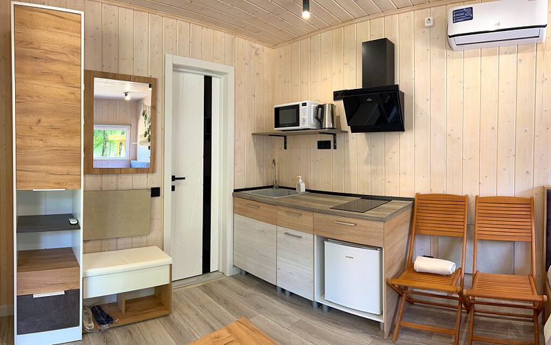 Домики-студии «Высокого берега» — это идеальное сочетание комфорта и природного очарования. В вашем распоряжении уютная спальная зона с двуспальной кроватью. Полностью оборудованная кухня со всей необходимой посудой и техникой. Бесплатный Wi-Fi для связи с близкими и публикации ваших впечатлений.