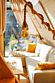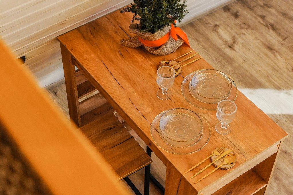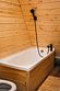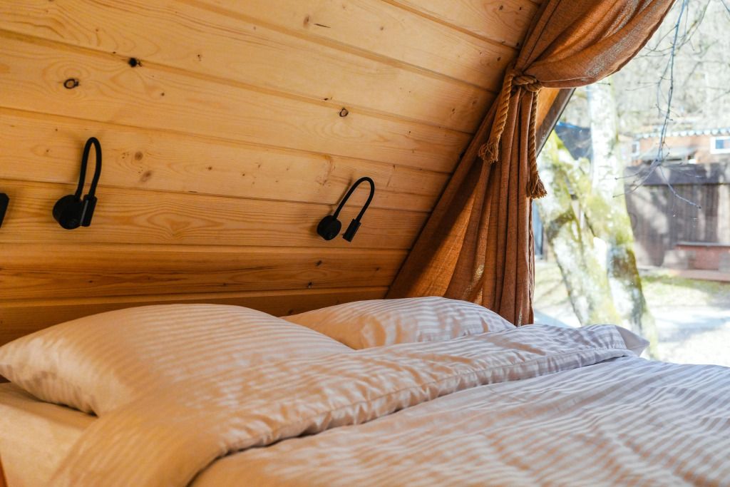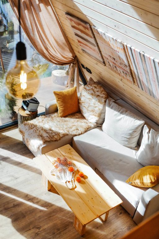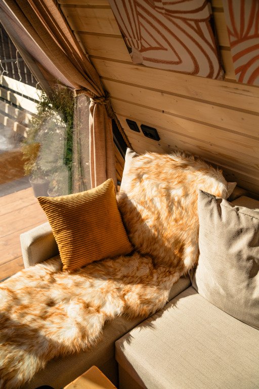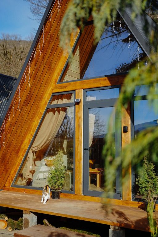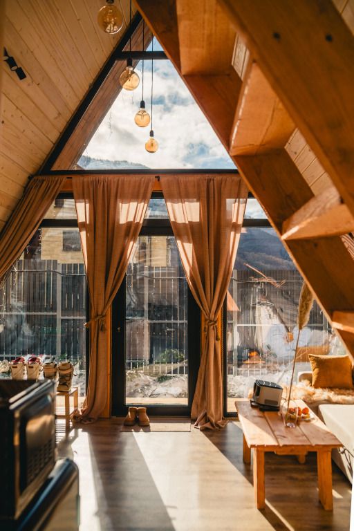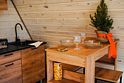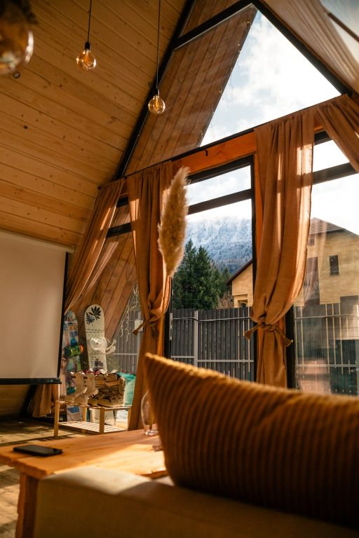 К услугам гостей коттедж площадью 36 кв. м с панорамными окнами и с эко-дизайном, выполненном с использованием натуральных материалов. Имеется гостиная-трансформер, в которой гости найдут лаунж с видами на горы и кинозал с проектором. Кухня оснащена посудой, необходимой для приготовления пищи. Также к услугам гостей ванная с relax эффектом и фирменная соль для ванн с хвоей. Спальня расположена на мансарде, спальное место располагается под деревянными балками.