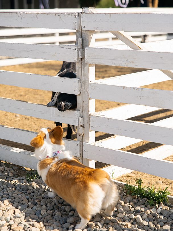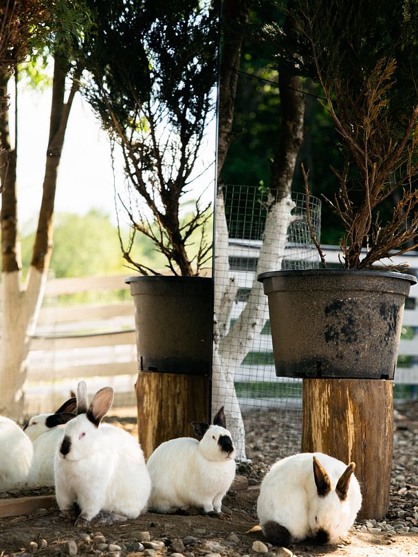 На территории расположено невероятно теплое, милое и пушистое пространство с белыми кроликами, их сейчас 65 особей (все животные привиты). Всех крольчат можно брать на руки и кормить морковкой (предоставляется глэмпингом), дети их особенно обожают.