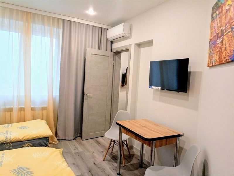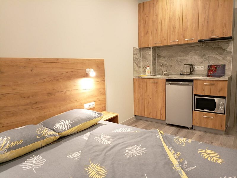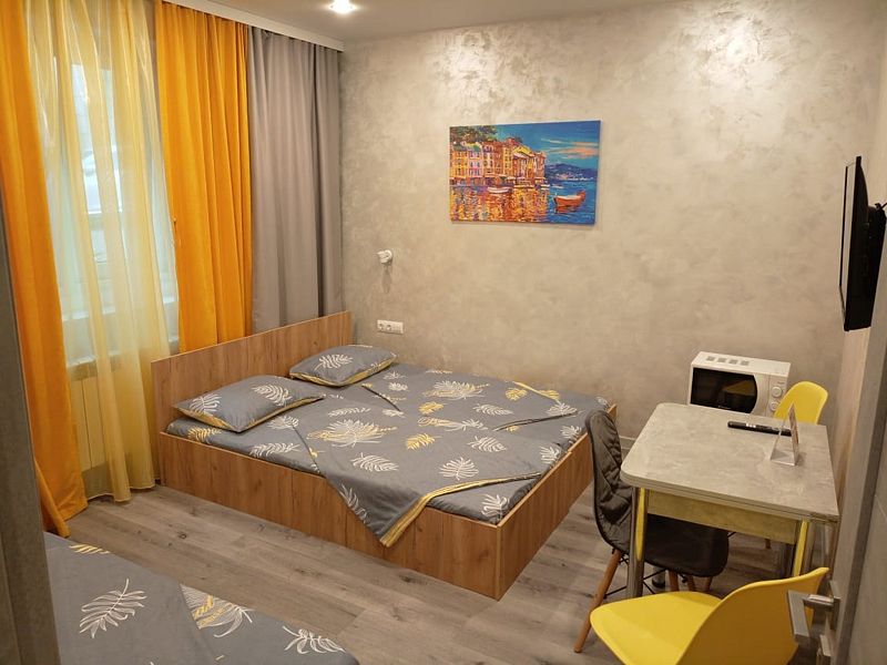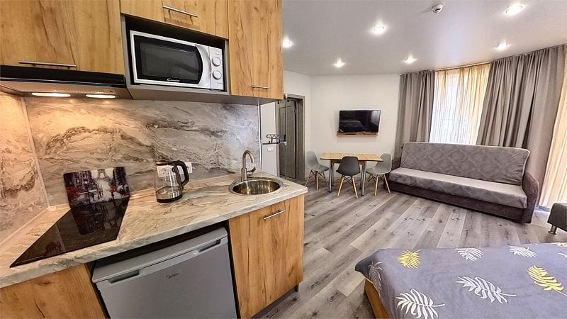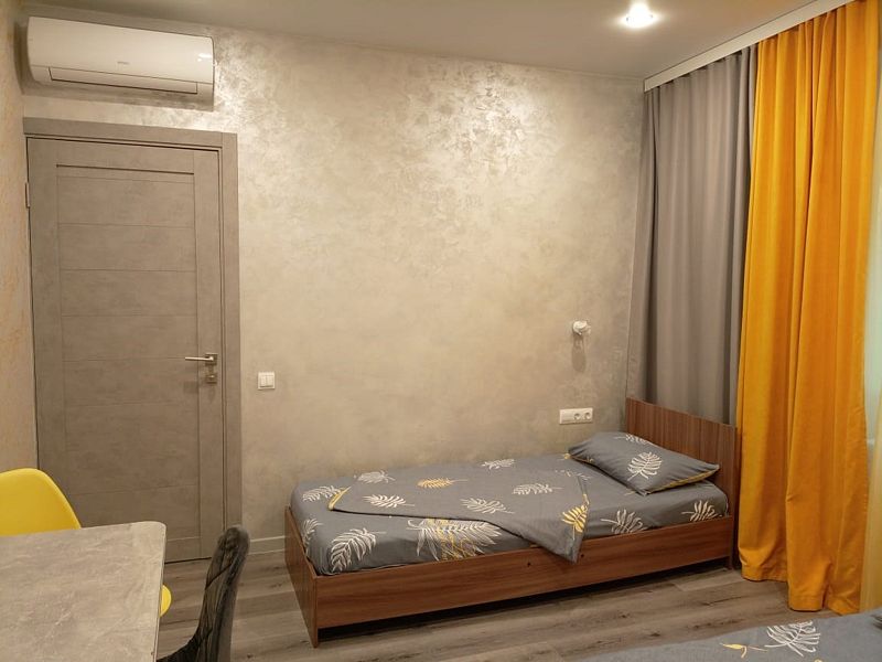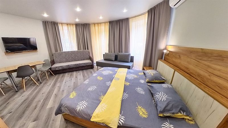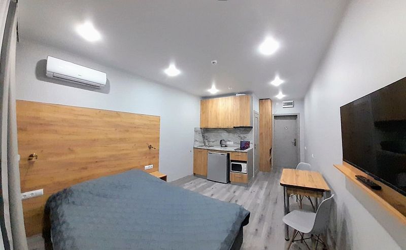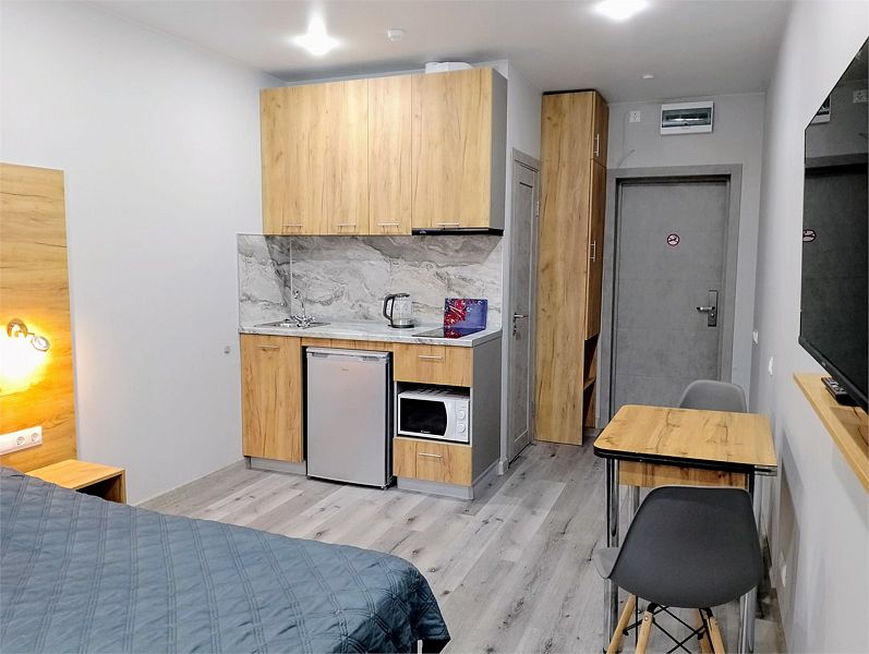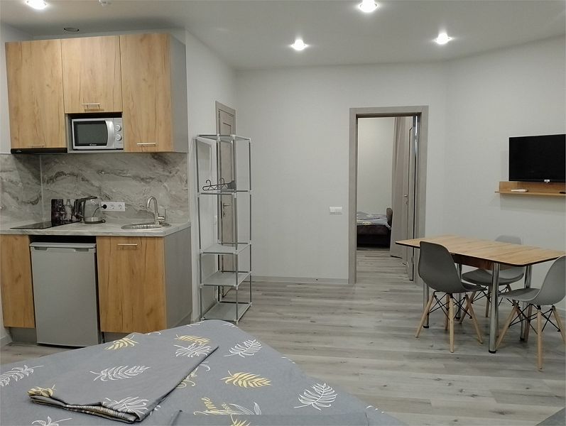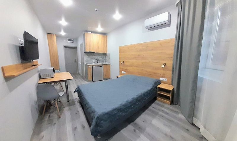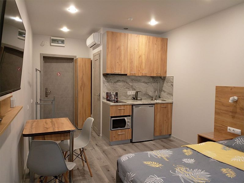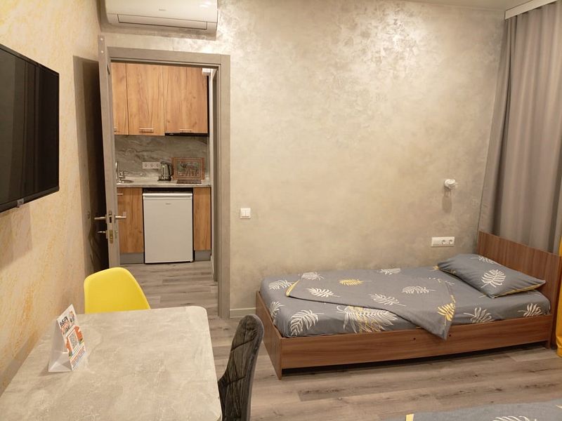 Уютные, в современном стиле комфортабельные номера. В студии кондиционер, холодильник, встроенная кухня,необходимая бытовая кухонная техника, набор посуды. В шаговой доступности море, остановки общественного транспорта, магазины, столовые, рестораны, кафе.