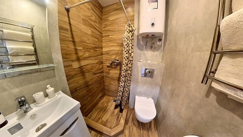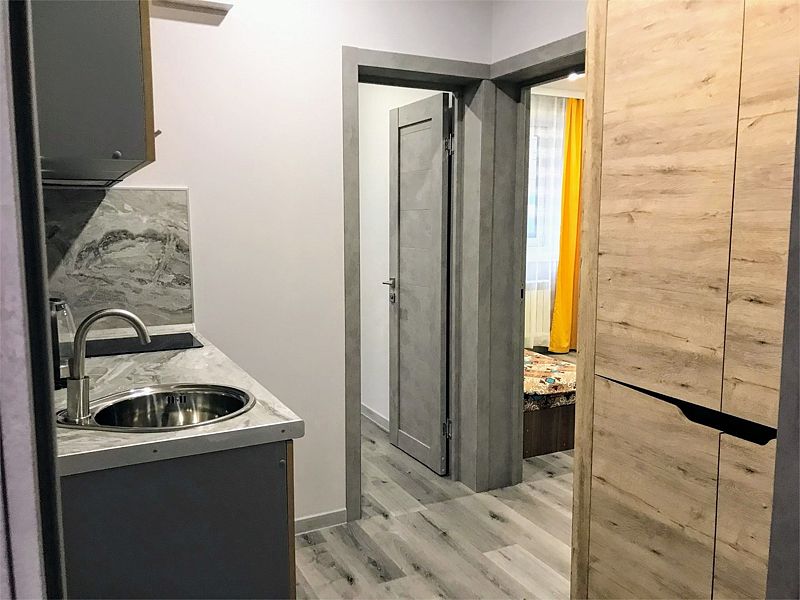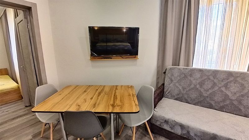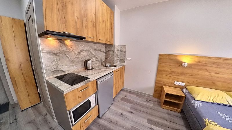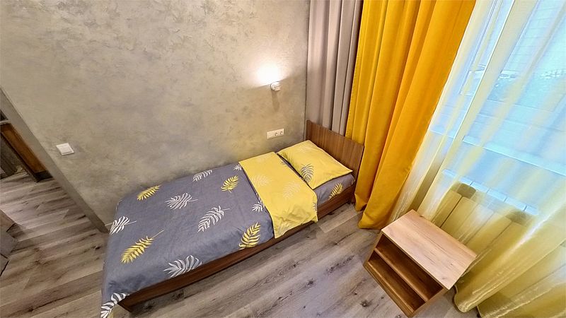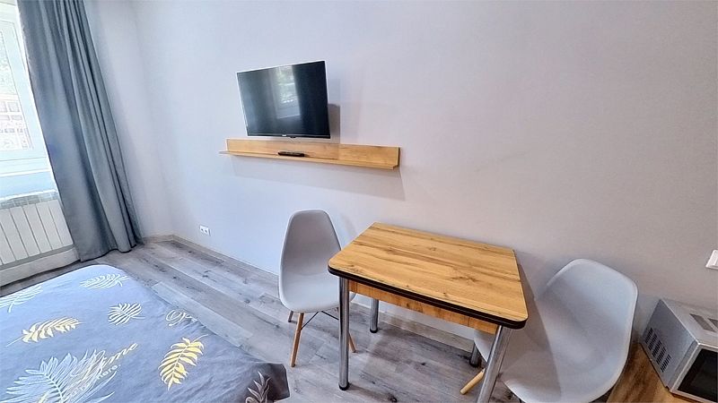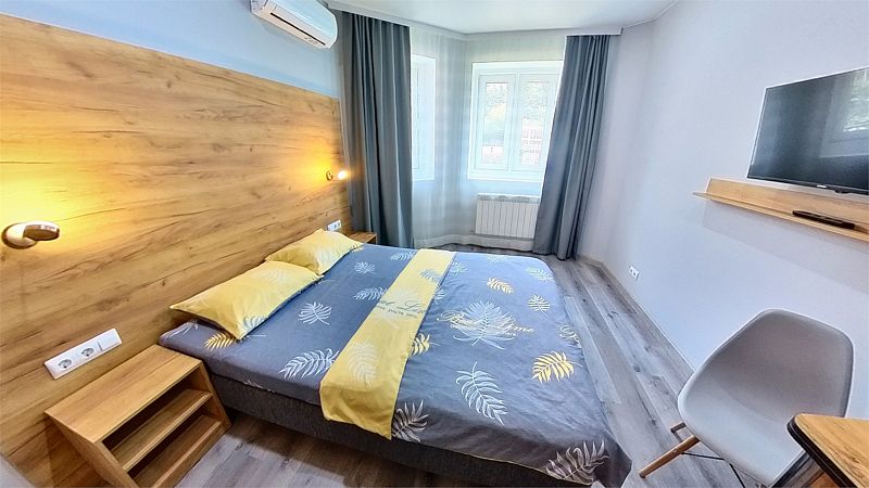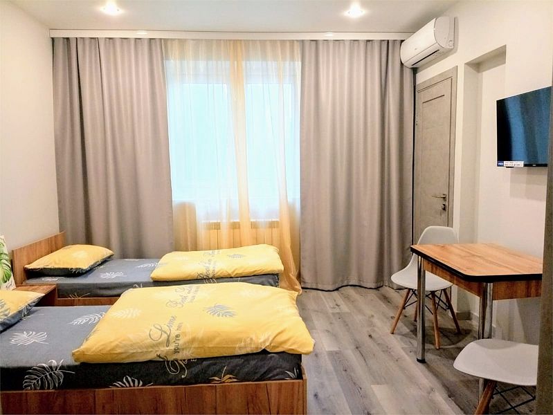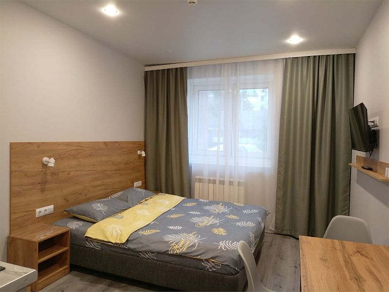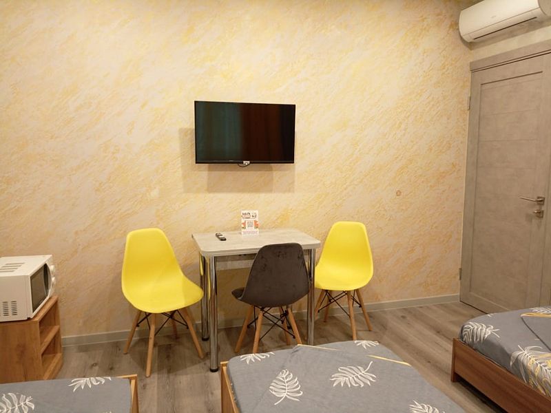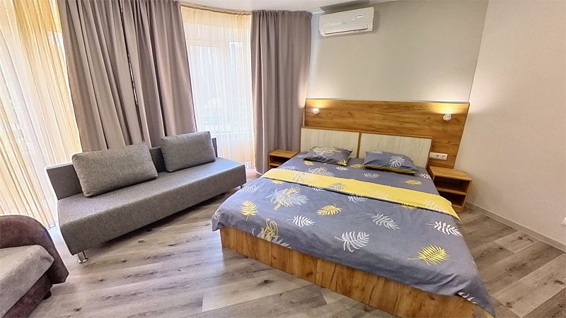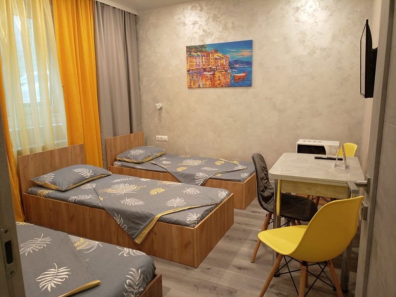Уютные, в современном стиле комфортабельные номера. В студии кондиционер, холодильник, встроенная кухня,необходимая бытовая кухонная техника, набор посуды. В шаговой доступности море, остановки общественного транспорта, магазины, столовые, рестораны, кафе.