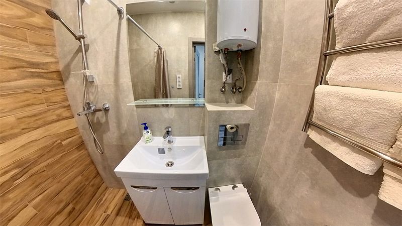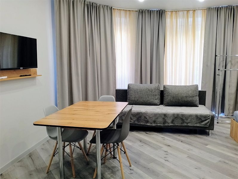 Апартаменты в современном стиле, с балконом. В апартаментах предусмотрены удобные матрасы, гипоаллергенные подушки, постельное белье премиум класса для комфортного отдыха. В апартаментах кондиционер, фен, холодильник, встроенная кухня, электрический чайник, обеденный стол, микроволновка.