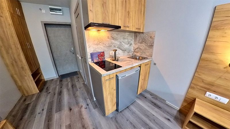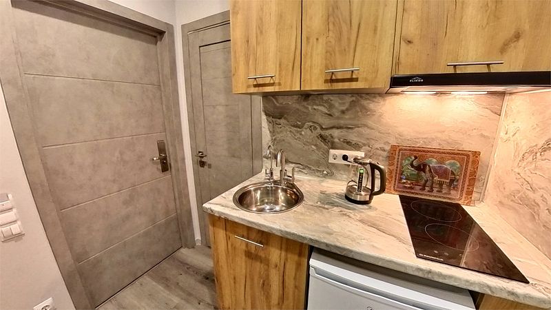 В каждом апартаменте собственная кухня с набором посуды, с встроенной электрической варочной поверхностью, есть микроволновая СВЧ печь, холодильник, электрический чайник.
