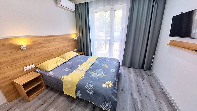 Делюкс апартаменты состоят из двух изолированных комнат. В апартаментах кондиционеры, холодильник, двуспальная кровать, односпальная кровать, диван, телевизор, встроенная кухня, необходимая бытовая кухонная техника, набор посуды.