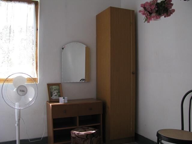 Деревянные кровати, тумбочки, платяной шкаф, зеркало, прикроватные коврики, вентилятор