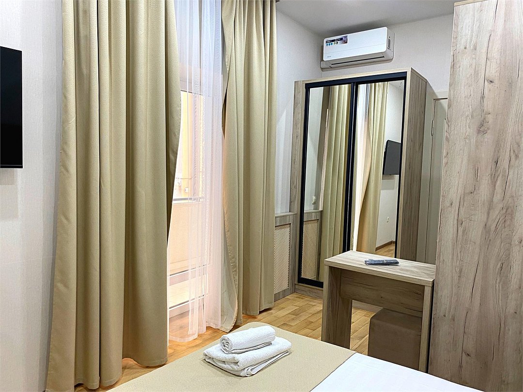 телевизор, Wi-Fi, кондиционер, светильник, фен, банные полотенца, гигиенические средства, балкон, две односпальные или большая двуспальная кровать, вешалки, зеркало, пуфики, унитаз, раковина, душ, тумба, туалетный столик, мангал, мини-холодильник, шкаф-купе, частный двор, мыло, затемняющая штора, зеркало в полный рост, без вида, можно с питомцамиВ гостиничном номере