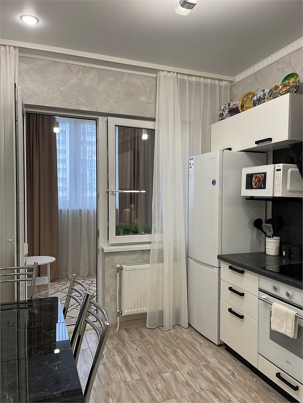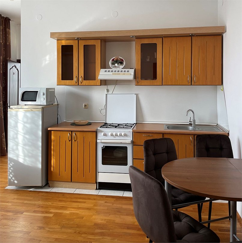 Диван раскладной, кресло раскладное на балконе, шкаф для одежды, комод, туалетный столик с зеркалом, кухонный гарнитур с электроплитой, холодильник, микроволновая печь, посуда, фен, пылесос, санузелУслуги и удобства