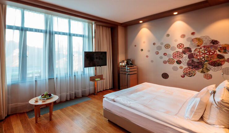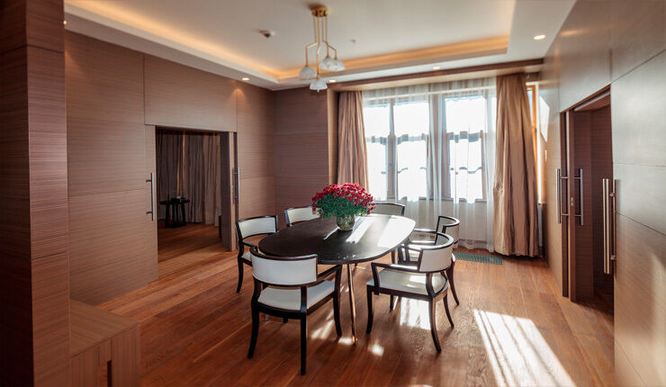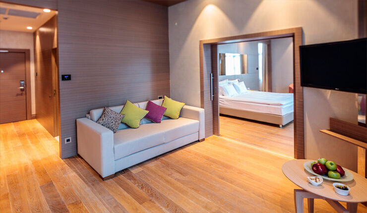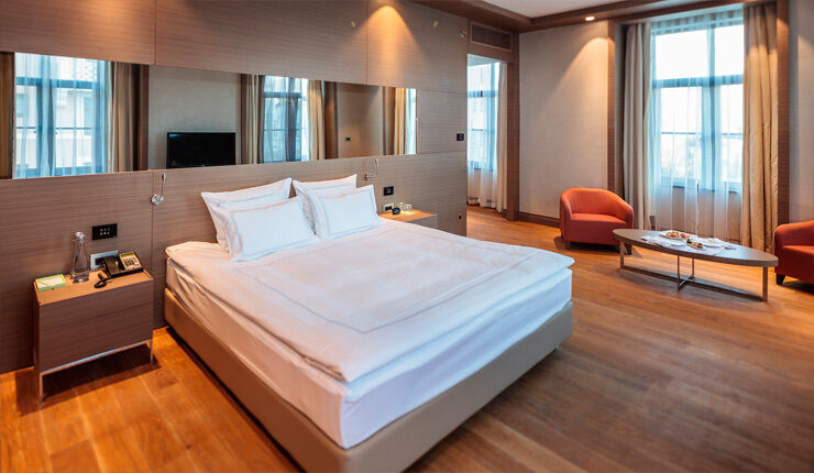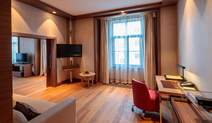 Отель располагает элегантными номерами Люкс для размещения 1-го или 2-х человек. Средняя площадь номера – около 55 кв.м. Номер разделён на две зоны: гостиную и спальню. Возможно забронировать номер с одной большой кроватью или двумя раздельными односпальными кроватями.