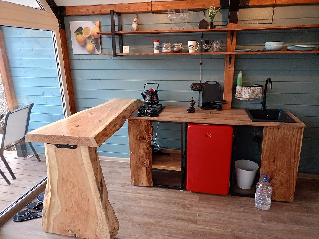 В доме отдельная спальня, гостиная с кухней, душевая и су. На большой террасе расположена отдельно стоящая ванна для милых дам и отличных фотографий на фоне природы.