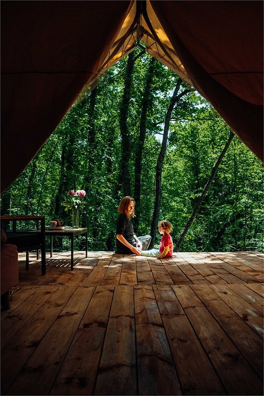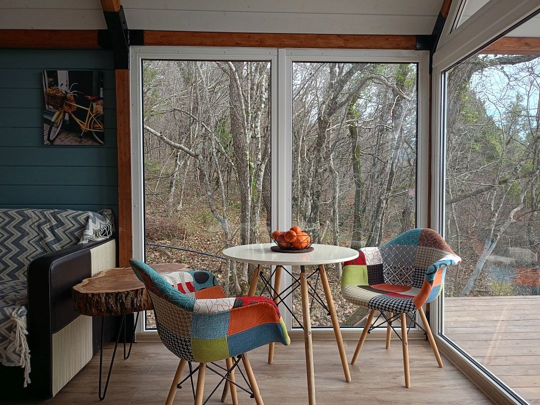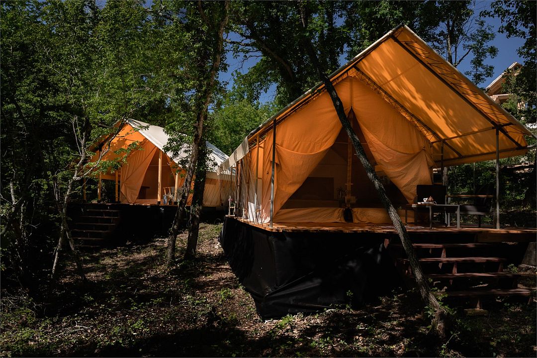 Сказочный сафари с большой и уютной террасой. Террасы у сафари расположены в разных домиках с разных сторон, но с каждой открывается одинаково прекрасный вид на реликтовый горный лес.