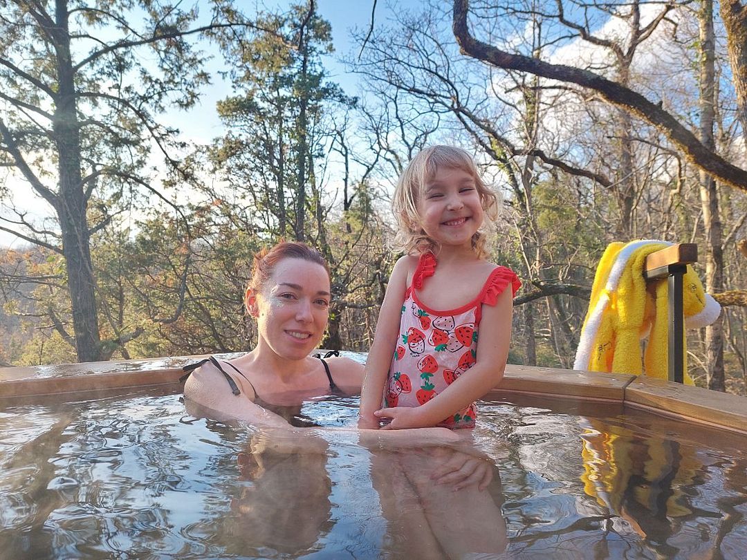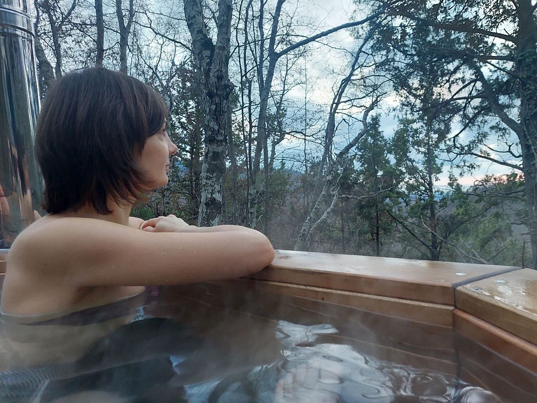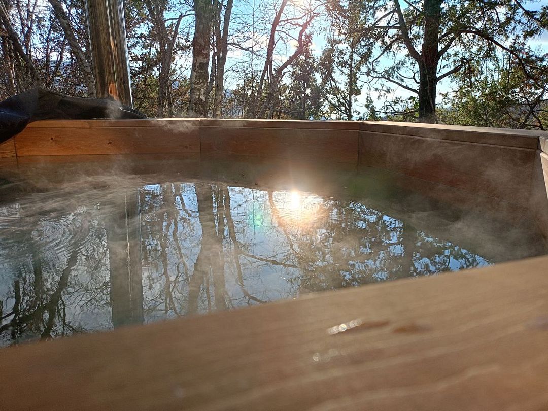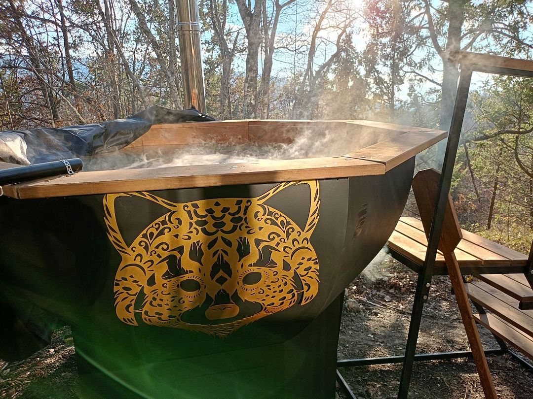 Великолепный банный чан на дровах в самом уединённом месте глэмпинга с домом Барн. Вы чудесно проведёте время в горячей воде и потрясающем виде на горы, лес и долину.