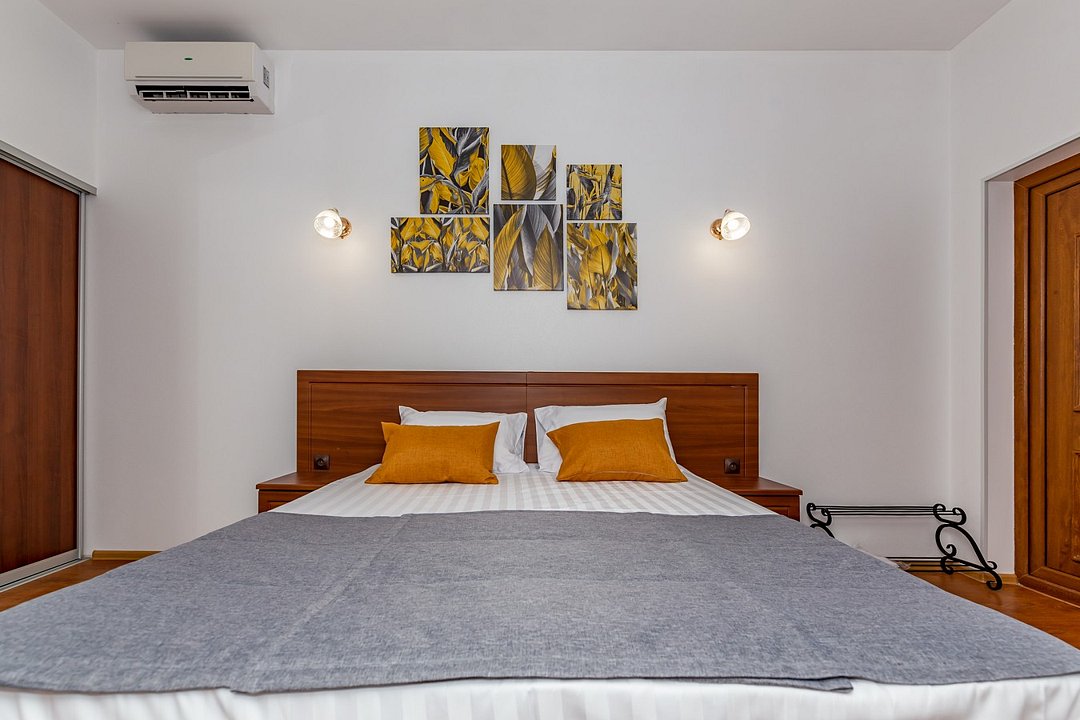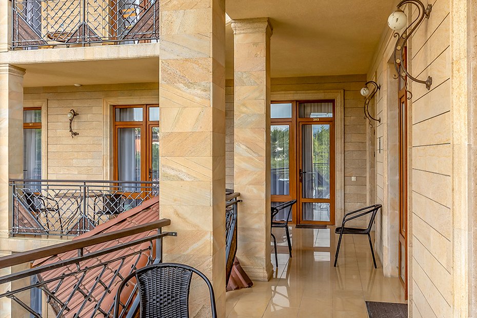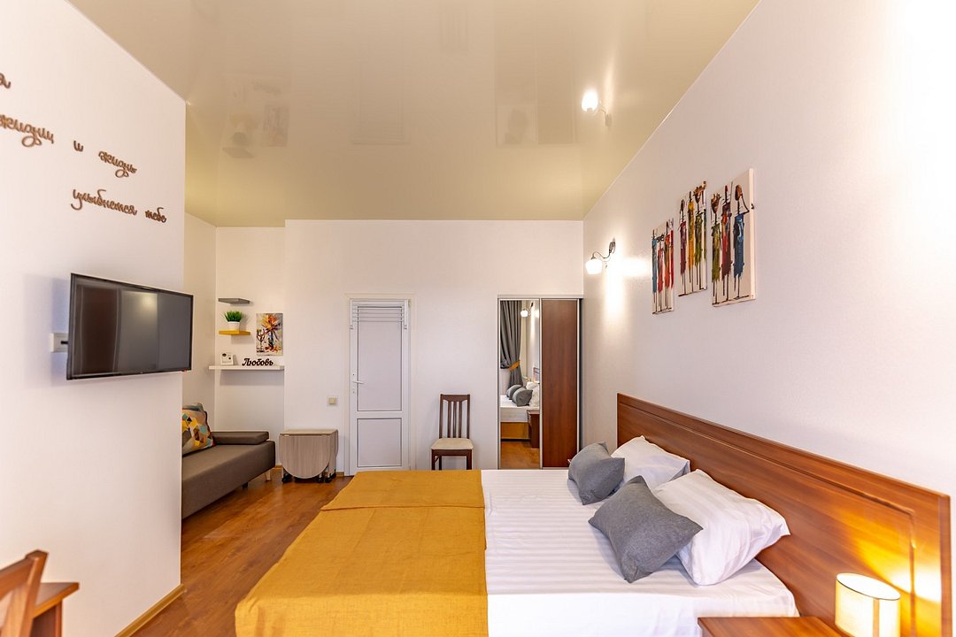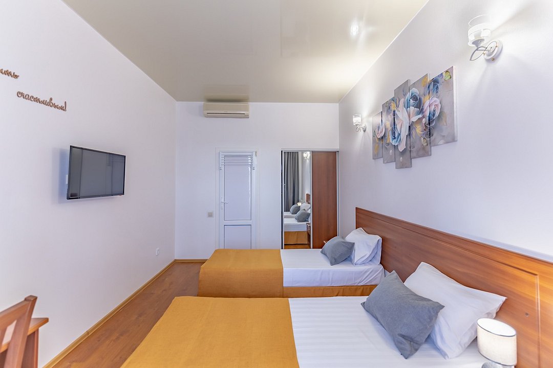 Номера гостевого дома оснащены всем необходимым для приятного пребывания: быстрый Wi-Fi, спутниковое и SMART ТВ, кондиционер и мини-холодильник. Уютные комнаты с портьерами блэкаут и установленными часами тишины создают идеальные условия для спокойного сна. Просторная терраса с удобной мебелью приглашает гостей на утренние завтраки или вечерние чтения на свежем воздухе.