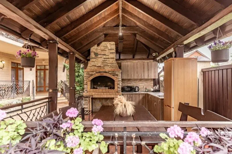 Уютная летняя кухня предназначена для самостоятельного приготовления пищи — здесь легко создать завтрак, быстрый перекус или приготовить ароматное мясо на мангале. Во дворе, окруженном зеленью, расставлены столики для обедов, превращая пространство в уголок домашнего уюта и гармонии.