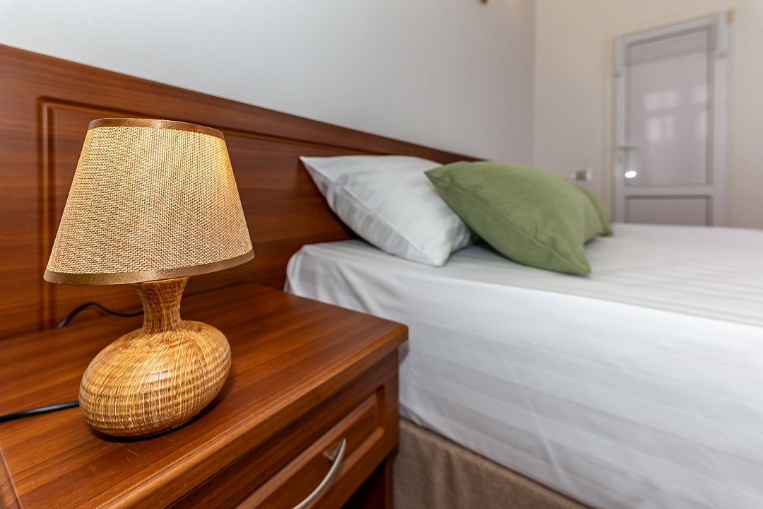 Очень уютный номер, который идеально подойдет для молодой семейной пары. Внутри есть все необходимое: быстрый и бесплатный Wi-Fi, кондиционер, мини холодильник, сейф, телевизор с плоским экраном, зеркало, вешалки и комод для одежды, кружки, стаканы, чайник.