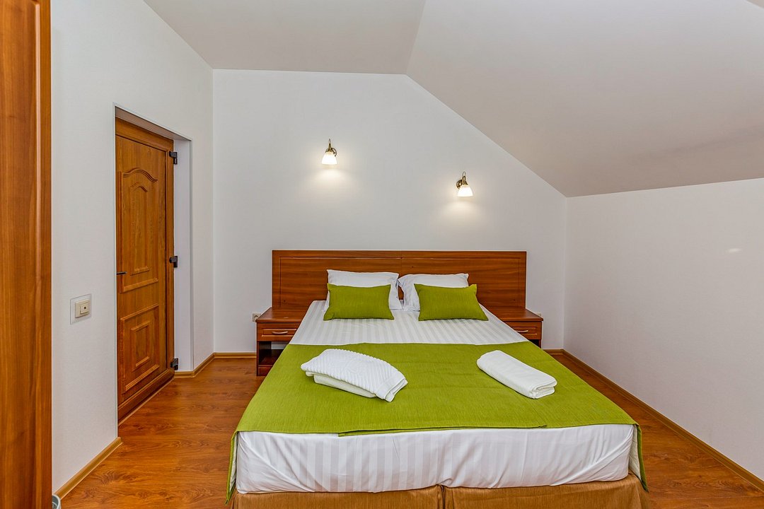 Стандартный двухместный семейный номер с одной двуспальной кроватью. Уютные апартаменты площадью пятнадцать квадратных метров идеально подходят как для двухместного, так и для семейного размещения. Имеют уютную спальню.
