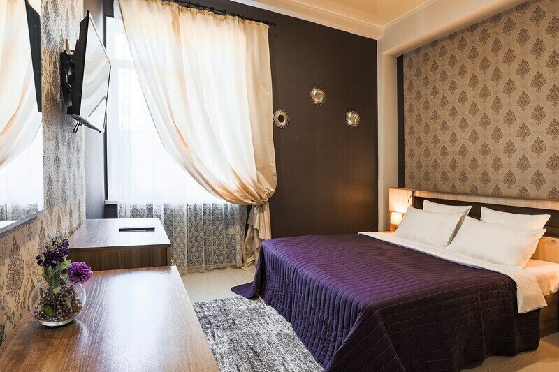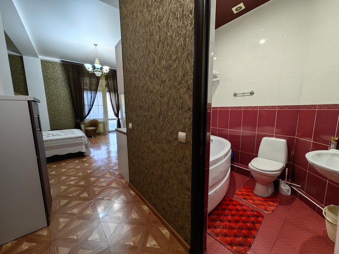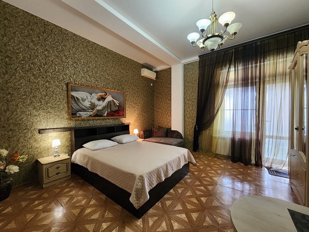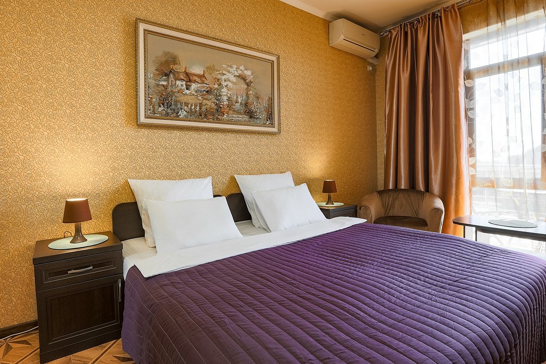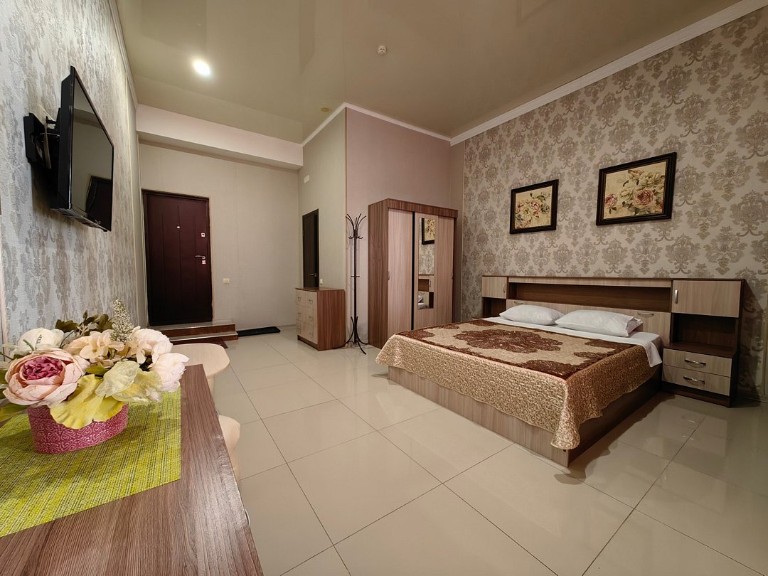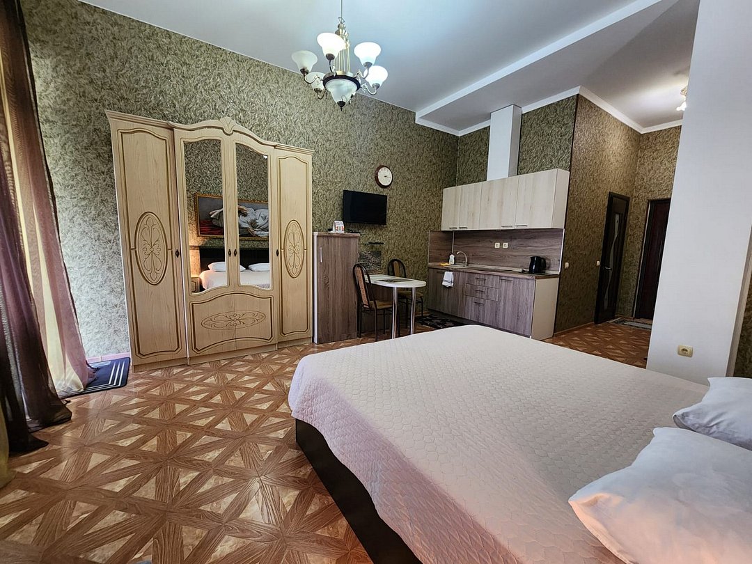 В номере: 1 двуспальная кровать, 1 двуспальный диван. Имеется телевизор, кондиционер, фен, шкаф, вешалка, журнальный столик, стулья, комод, холодильник, газовая плита, чайник, посуда, столовые приборы. Индивидуальная ванная комната: ванна, раковина, туалет. В стоимость входит: Постельное бельё, полотенца. WI-Fi бесплатно на всей территории. Платная парковка на территории.