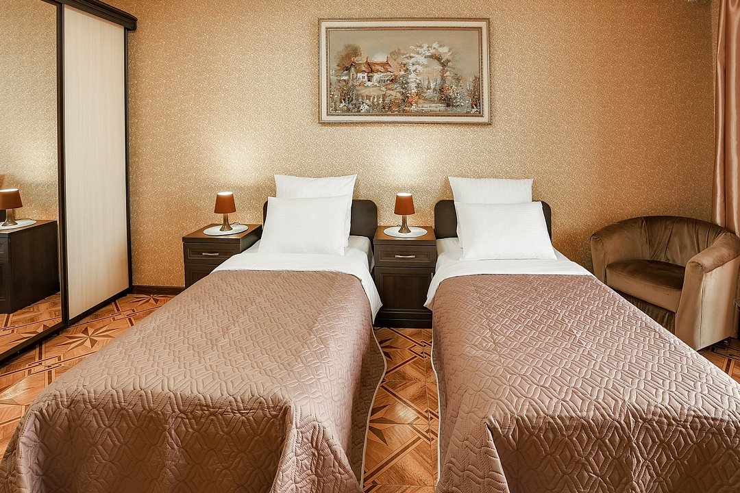 В номере: 1 двуспальная кровать или 2 односпальные кровати, 1 еврораскладушка.