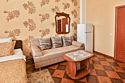 В номере: 1 двуспальная кровать, 1 двуспальный диван, 1 евро-раскладушка. Имеется телевизор, кондиционер, фен, шкаф, вешалка, журнальный столик, стулья, комод, холодильник, газовая плита, чайник, посуда, столовые приборы. Индивидуальная ванная комната: ванна, раковина, туалет. В стоимость входит: Постельное бельё, полотенца. WI-Fi бесплатно на всей территории. Платная парковка на территории.