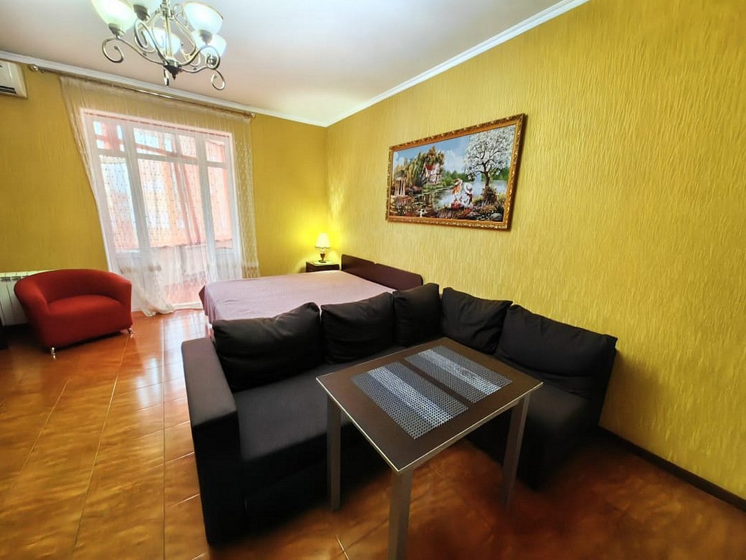 Апартамент-студия площадью 45 кв.м с лоджией с видом во двор. Подходит для размещения 5 человек. (4 осоновных места+ 1 дополнительное). Апартаменты с приятным интерьером.