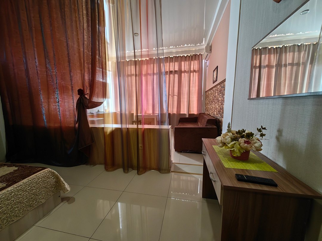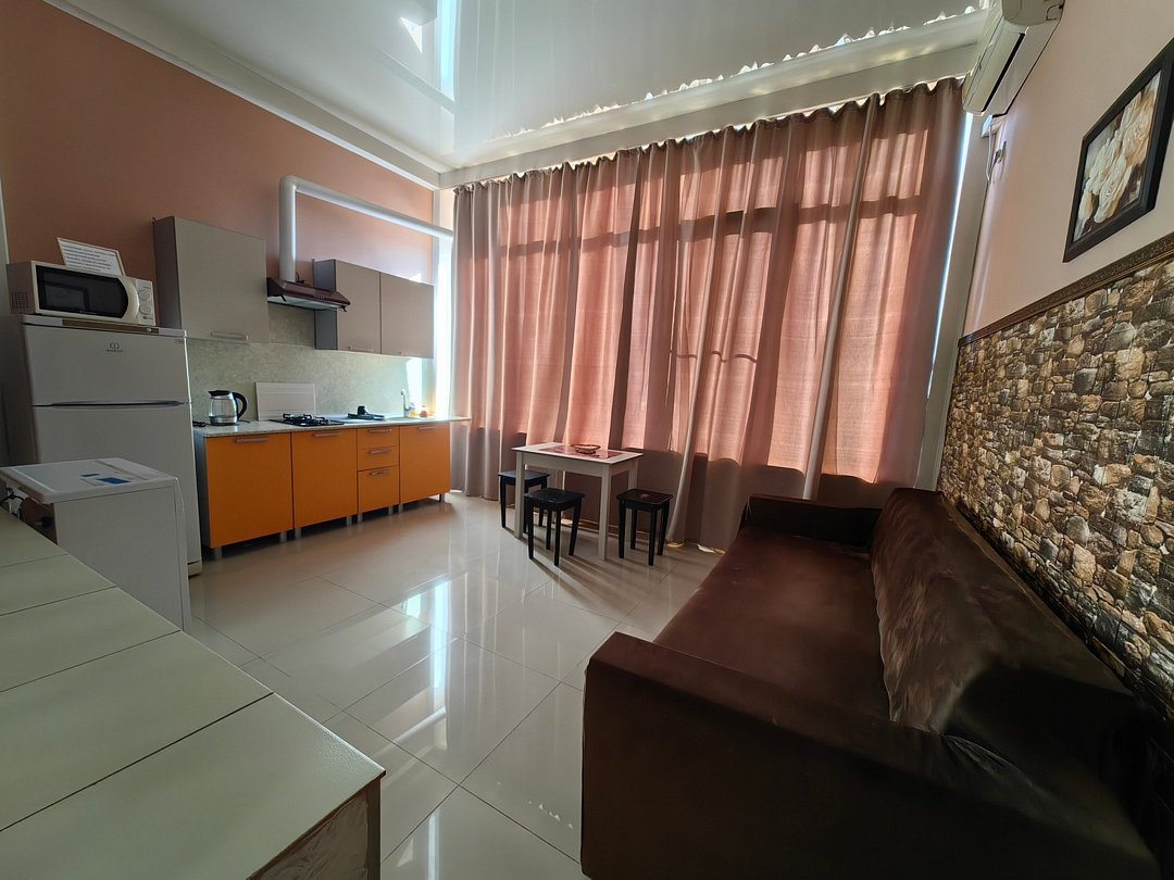 Апартамент-студия без балкона площадью 34 кв.м с видом во двор. Подходит для размещения 4 человек. Апартаменты с приятным интерьером.